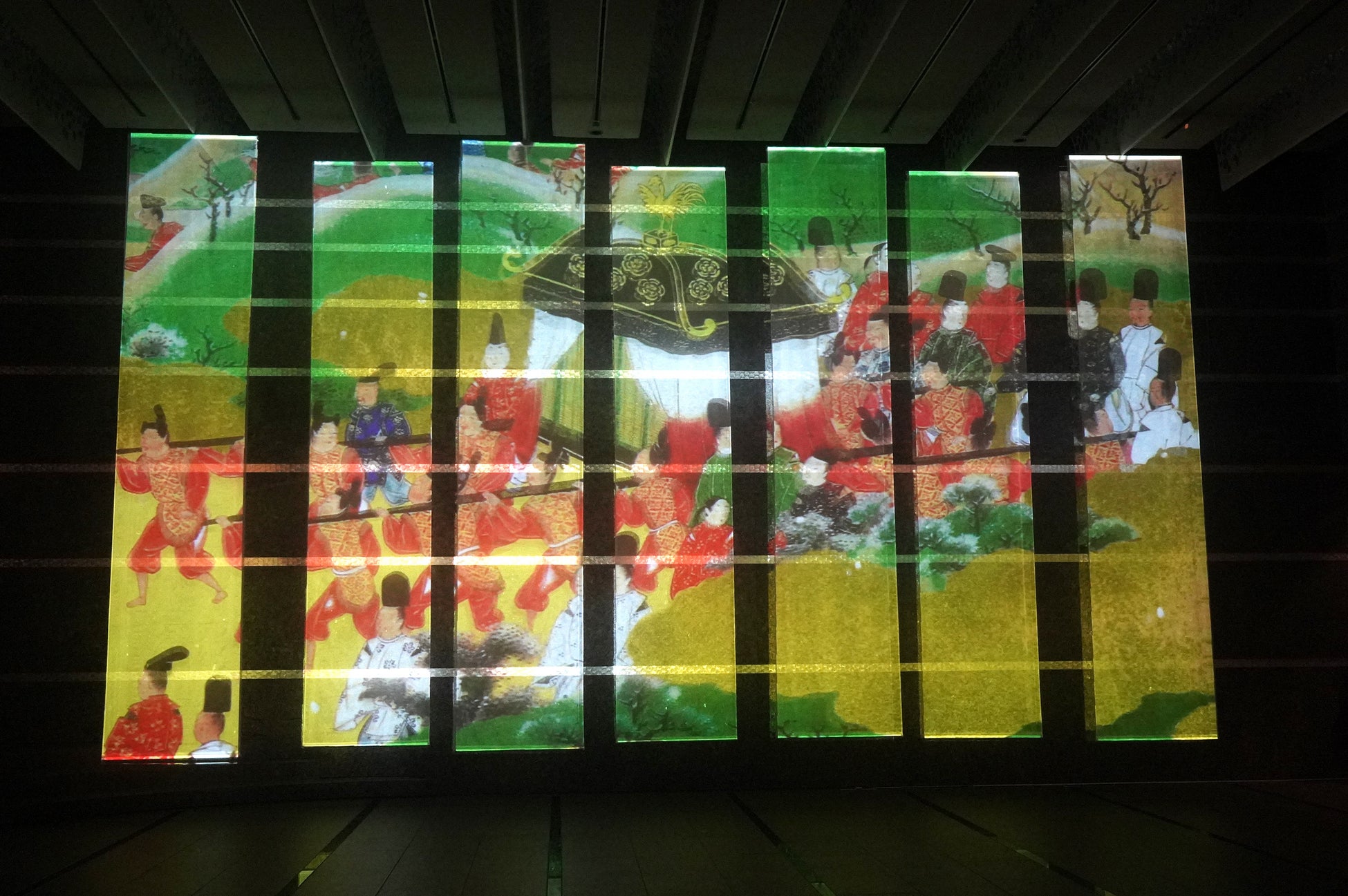 斎宮歴史博物館のエントランスホールに博物館が所蔵する「伊勢物語図屏風」や「斎王群行絵巻」などをモチーフにしたデジタルアート作品を展示しました。