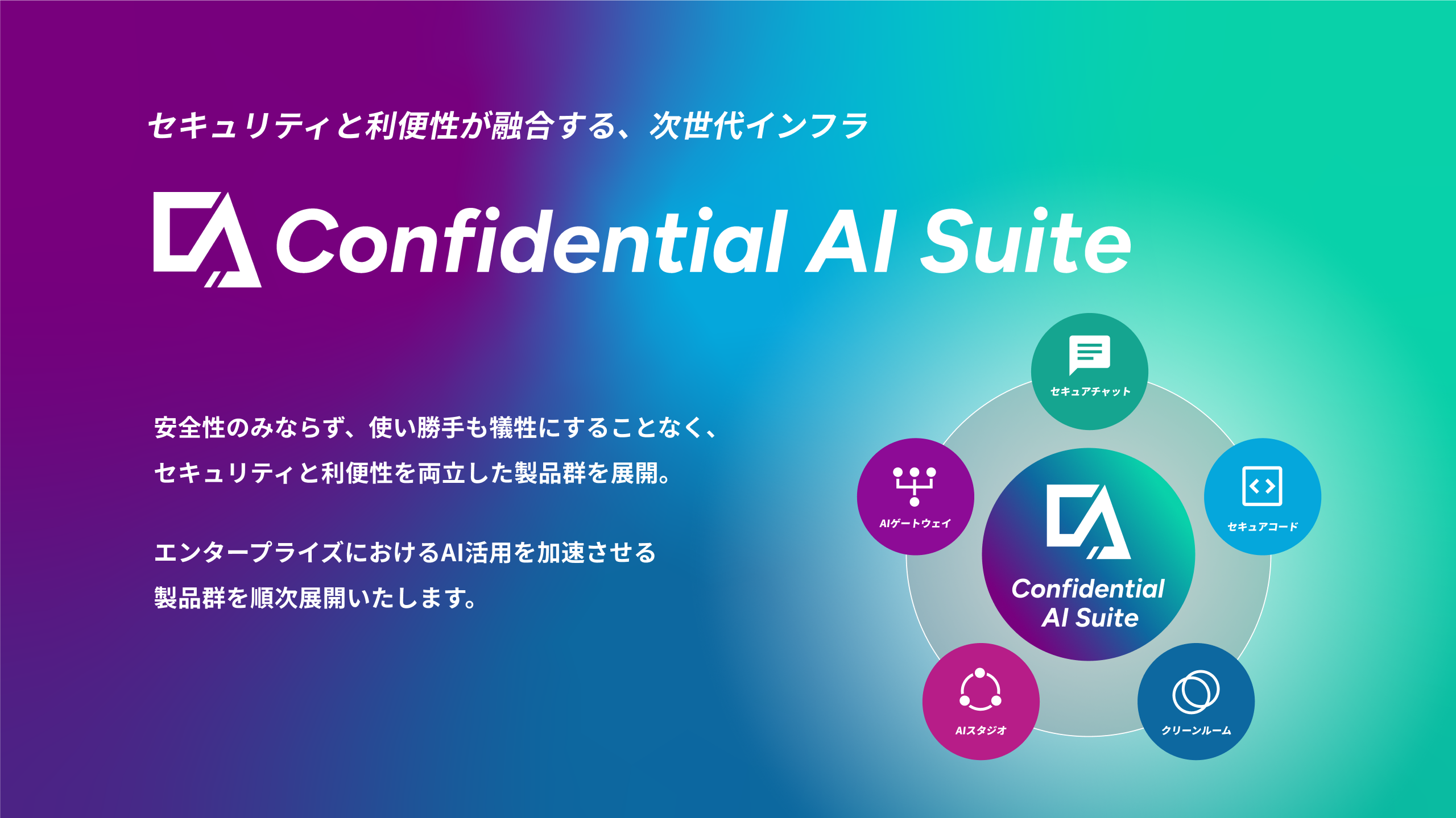 AI×データ活用が急速に進む一方、機密情報の漏洩リスクなどのセキュリティの課題が顕在化しています。Acompanyはこの課題に対し、秘密を守れる「Confidential AI(機密AI)」というアプローチで正面から取り組んでいます。KDDI様とのデータ活用事例をはじめ、大手企業への導入が進んでおり、AI製品ブランド「Confidential AI Suite」としてAcompany セキュアチャット、Acompany セキュアコードの提供を開始しています。