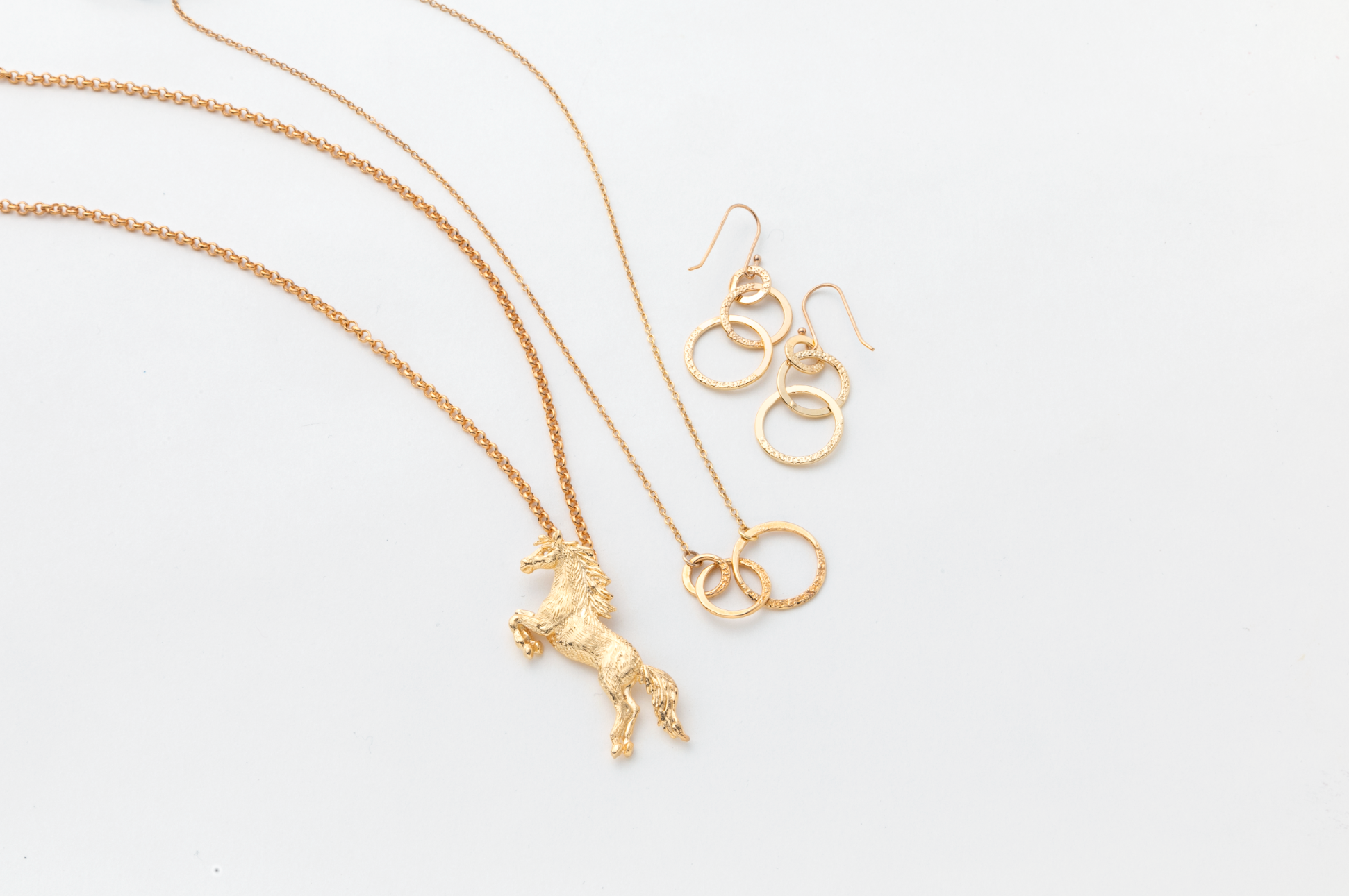 <ミラベル> 左)Leaping Horseチャームネックレス 23,100円 中)Lolitaネックレス 8,250円 右)Lolitaループピアス 6,600円