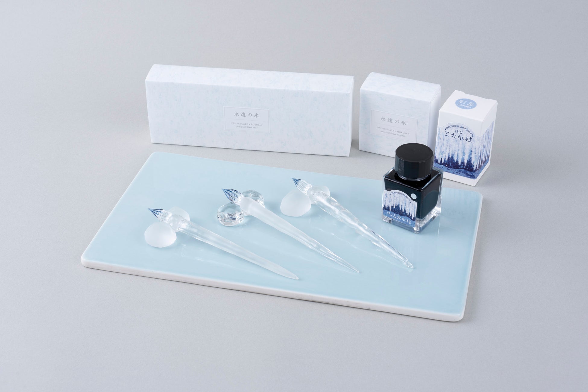 秩父三大氷柱から着想したガラスペン&ペンレスト。県内在住のガラス造形アーティストと一緒に試行錯誤し、中を空洞にする事で乱反射をつくり、サンドブラストという技法を用いて溶けかかった氷柱を表現した。