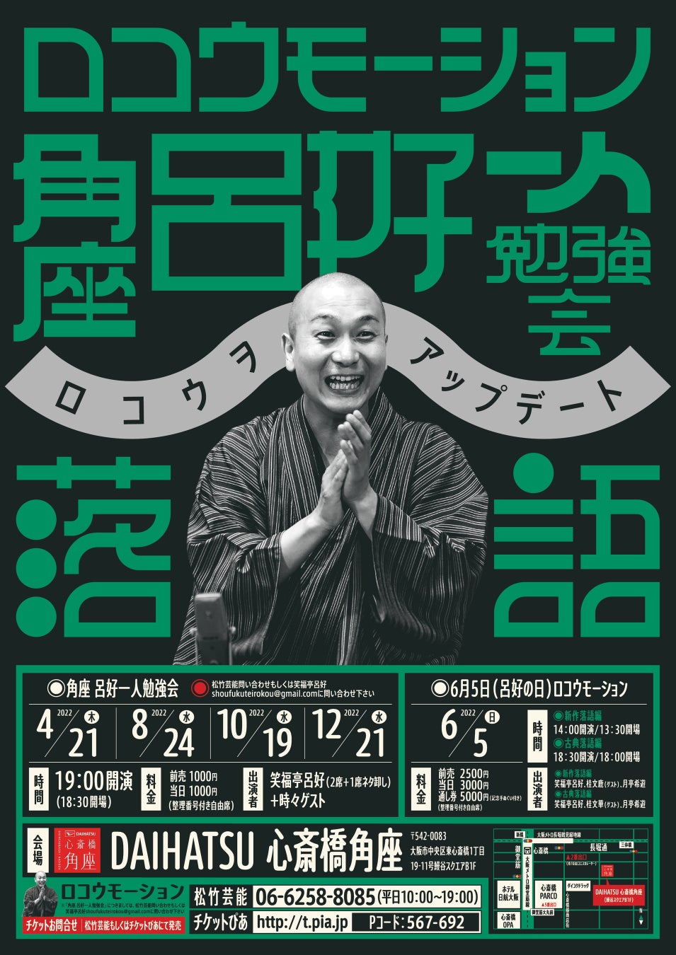 今回は、若手噺家チャレンジプロジェクト第2弾としまして、五楽笑人メンバーの笑福亭呂好が自身の芸名である「呂好」にちなみまして毎年6月5日を「呂好の日」と勝手に制定をいたしまして落語会を開催する事となりました。