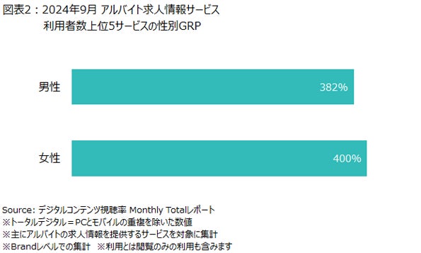 次に、利用者数上位5サービスを合計したターゲットGRPを性別に見ると、女性では400%で、男性の382%よりもやや高くなっていました(図表2)。
