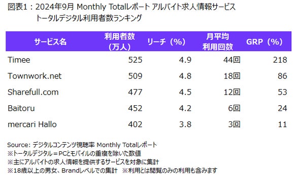 2024年9月のMonthly Totalレポートによると、アルバイト求人情報サービスにおいて、利用者数が最も多かったのは「Timee」で525万人、「Townwork.net」が509万人で続いていました。また、平均利用回数も同様に「Timee」が月44回で最も多く、「Townwork.net」が月18回で続いていました(図表1)。