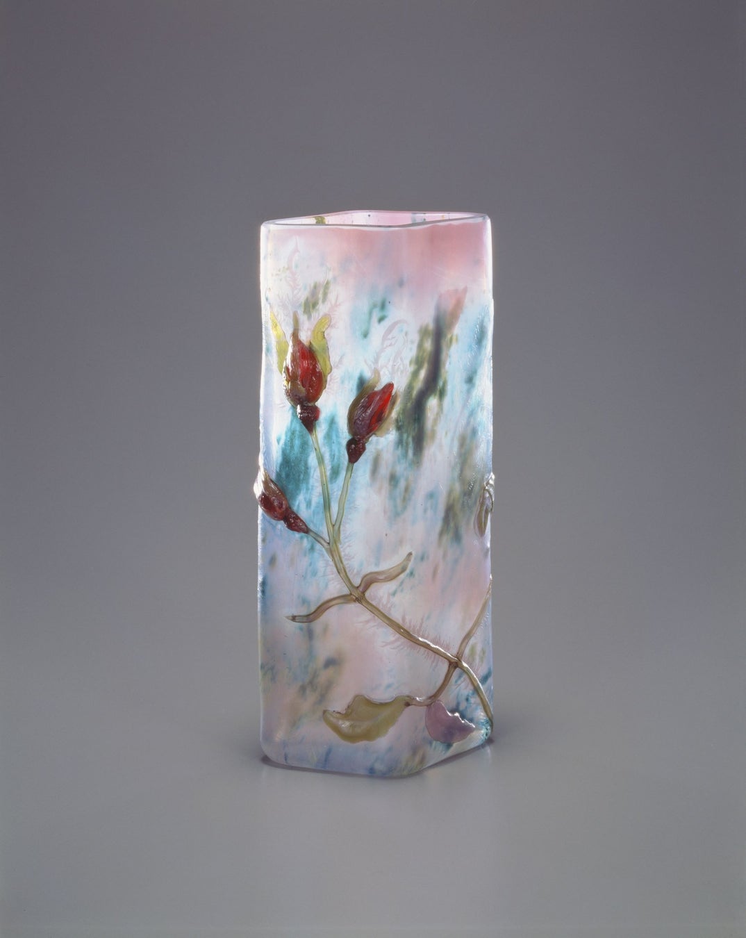 当館から望む北アルプスにたなびく幽玄な朝霞からインスピレーションを受けた展示室で、“はじまり”を感じられる空間。エミール・ガレの名作「花器『フランスの薔薇』」をはじめとする、アール・ヌーヴォーのガラス工芸品の数々を展示いたします。