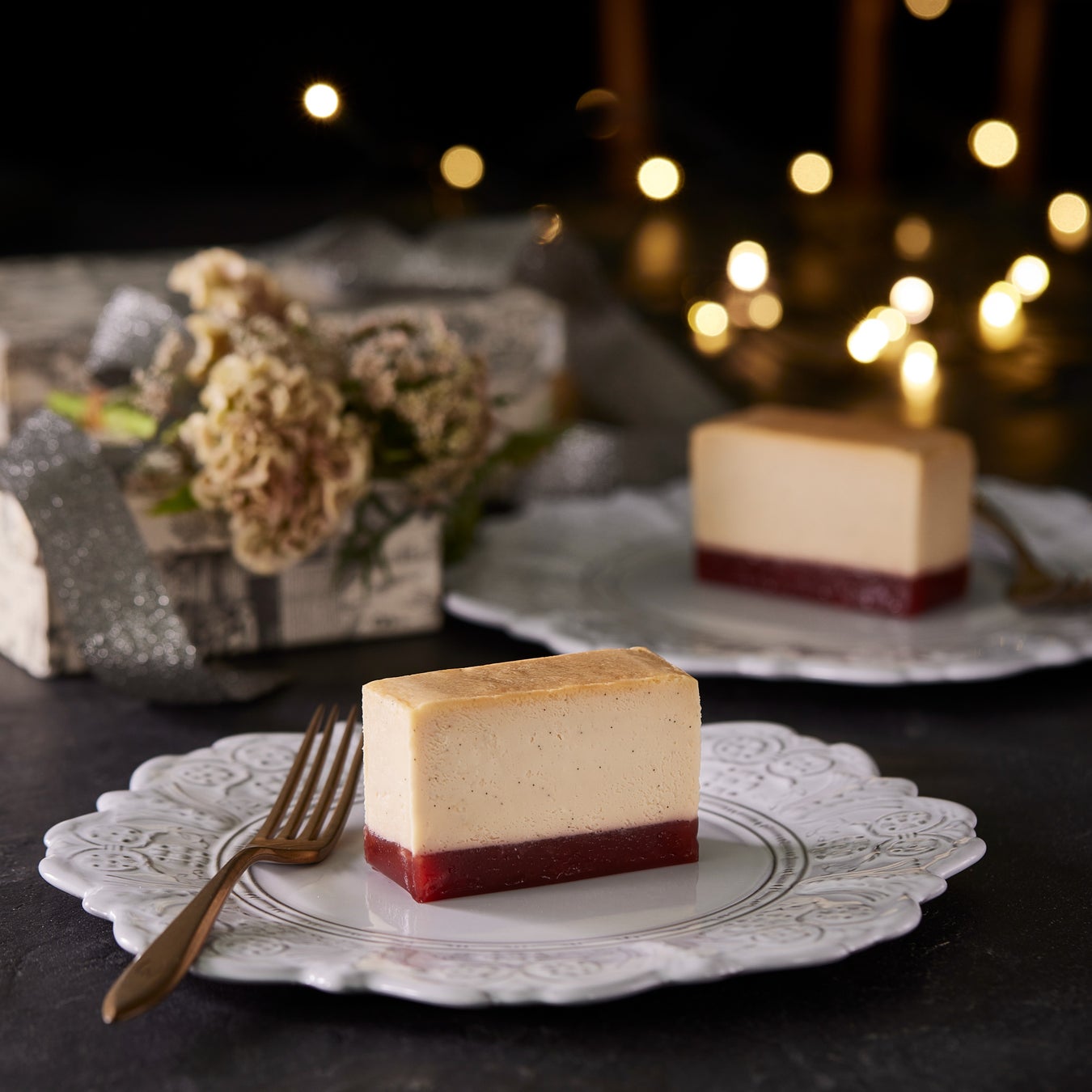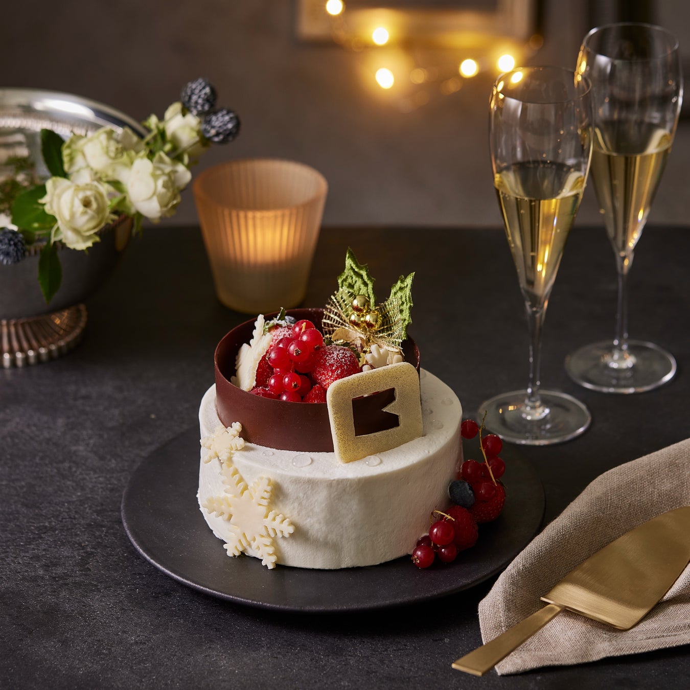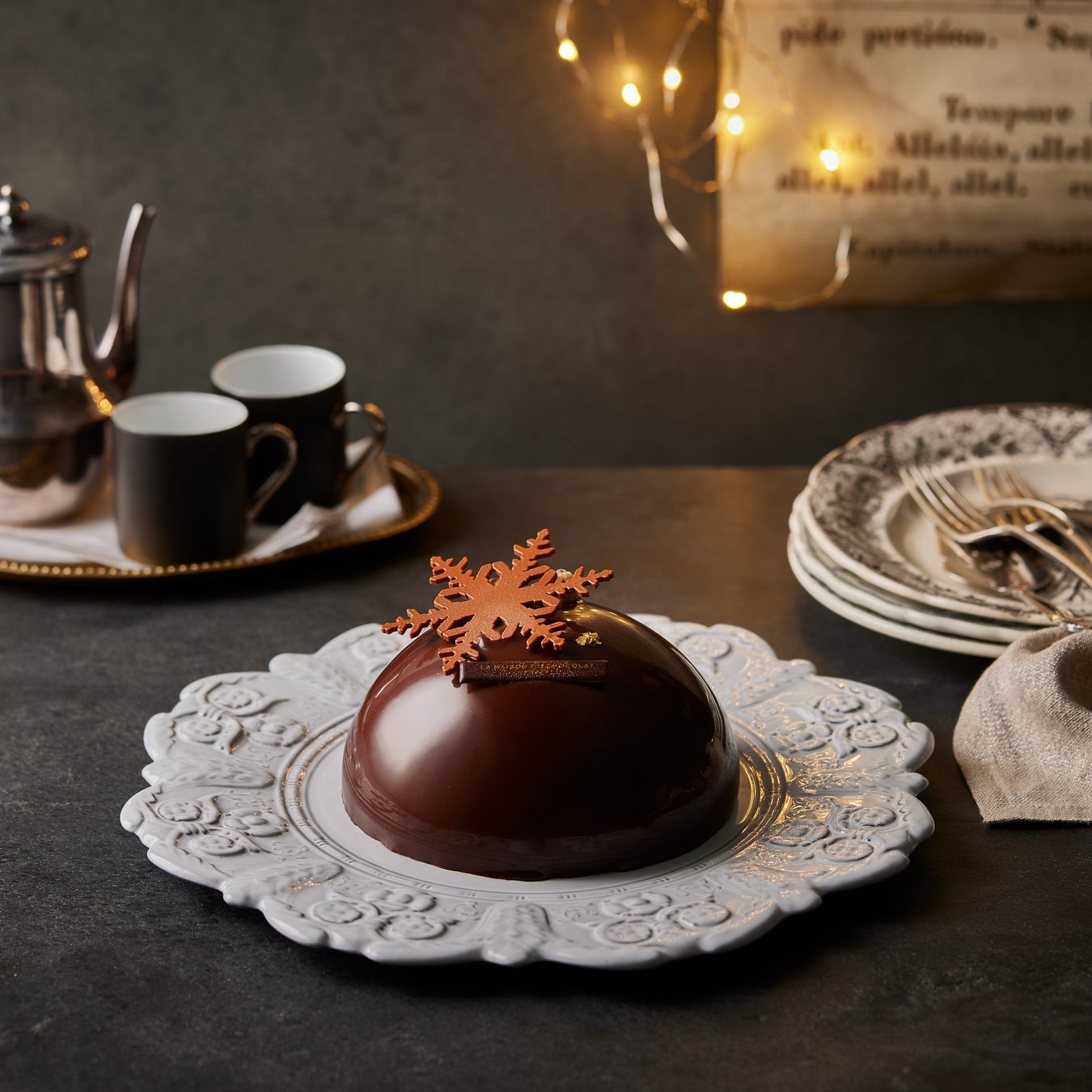 雪の結晶形の繊細なチョコレートを飾ったシックなクリスマスケーキ。アーモンドとヘーゼルナッツを使用したしっとりした生地に、ブルボンバニラ風味のクレームブリュレとダークチョコレートムースを重ね、艶やかなグラサージュで仕上げました。クレームブリュレとチョコレートムースのなめらかな口溶けをお楽しみください。