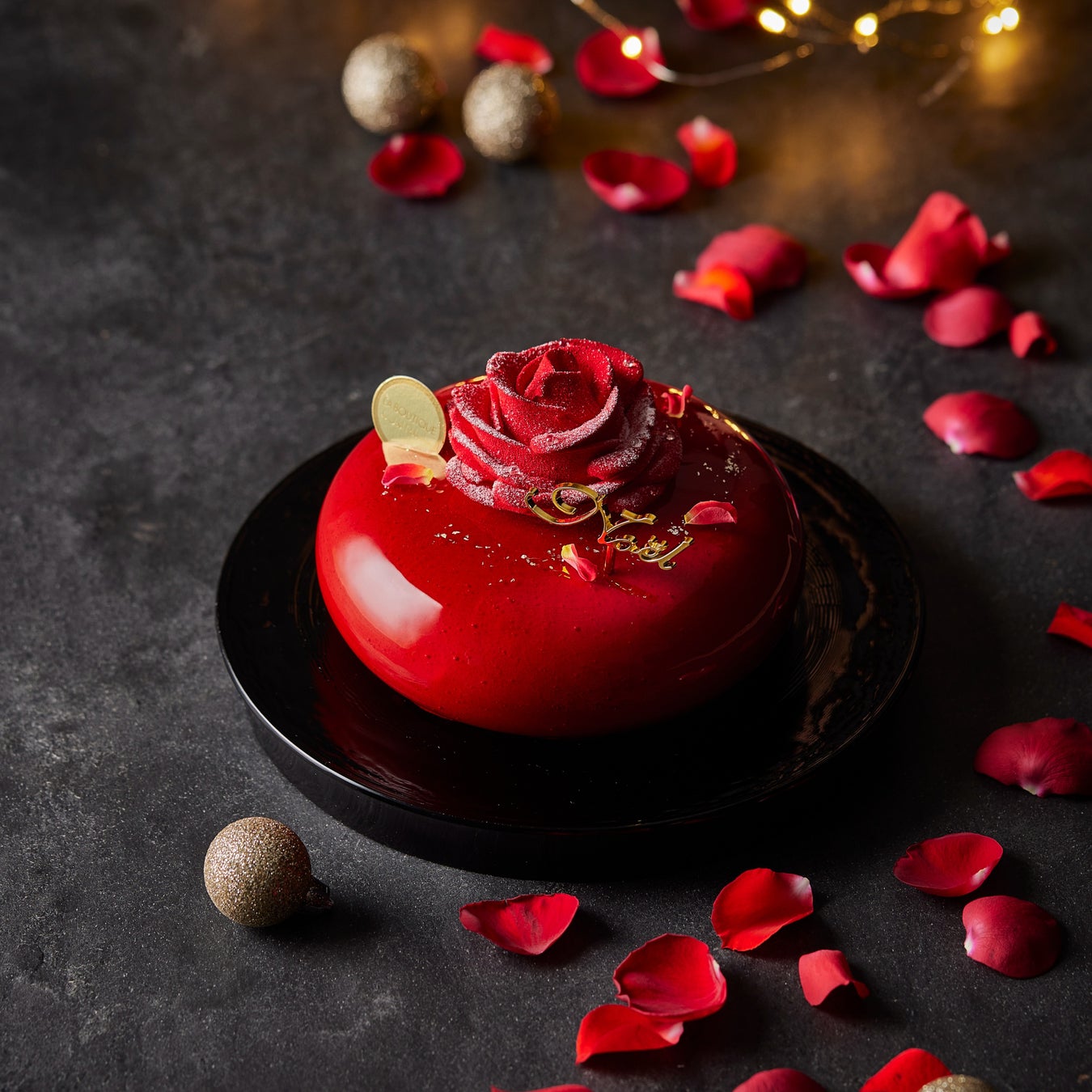 大きなバラをあしらった見た目も味わいも華やかなクリスマス限定ケーキ。マリー・アントワネットが愛したバラの花びらとフランス・ヴェルサイユの王立菜園で採れた新鮮なりんごで香り付けした「マリーアントワネットティー」を使用し、チョコレートのムースにバラ風味のラズベリーのジュレを閉じ込めました。