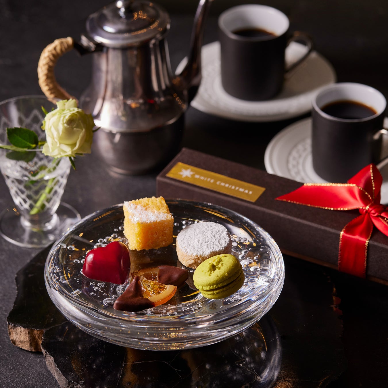 お洒落なボックスに詰められた自家製プチフールのセット。「ピスタチオ・マカロン」、「アールグレイ・トリュフ」、アマレットで風味を付けたとうもろこし粉のバターケーキ「アモール・ポレンタ」、ココナッツ風味の「ポルボローネ」、ドライオレンジをチョコレートでコーティングした「オランジェット」の全5種です。クリスマスシーズンのギフトにもおすすめです。