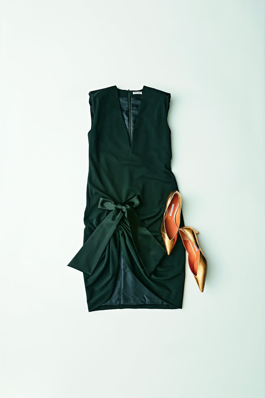 現在形のラグジュアリーに出合えるモードの殿堂エストネーション。ヘムをリボンで留めた黒のワンピースはパンツと合わせても◎。ゴールドのパンプスはVのカットが足をきれいに見せてくれます。
