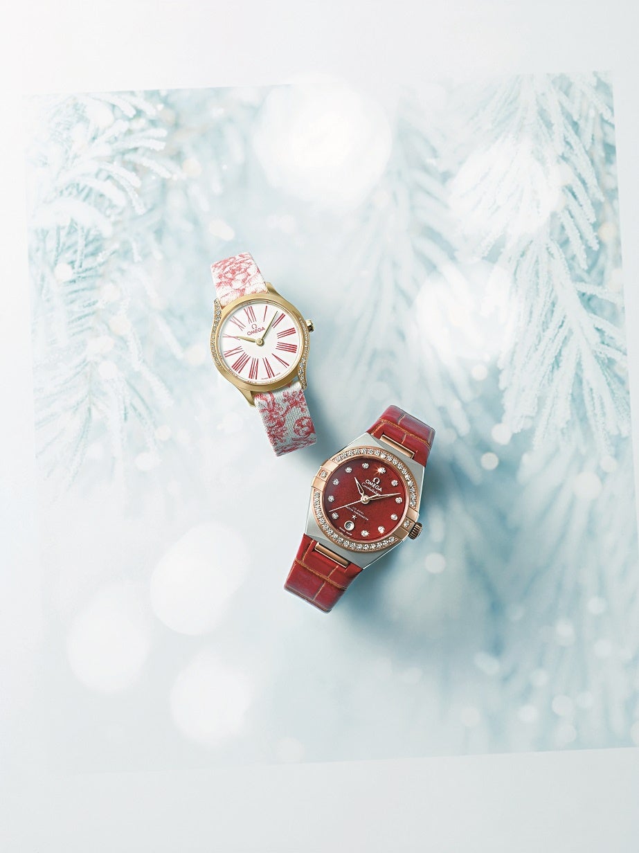 レディースウォッチは、これからの季節にふさわしい華やかなレッドをピックアップ。赤い花を描いたストラップはロマンティック派のあなたに。天然石の赤い文字盤をダイヤモンドのパヴェセッティングが飾る時計は、パーティーシーンでも会話が弾むカンバセーションピース。