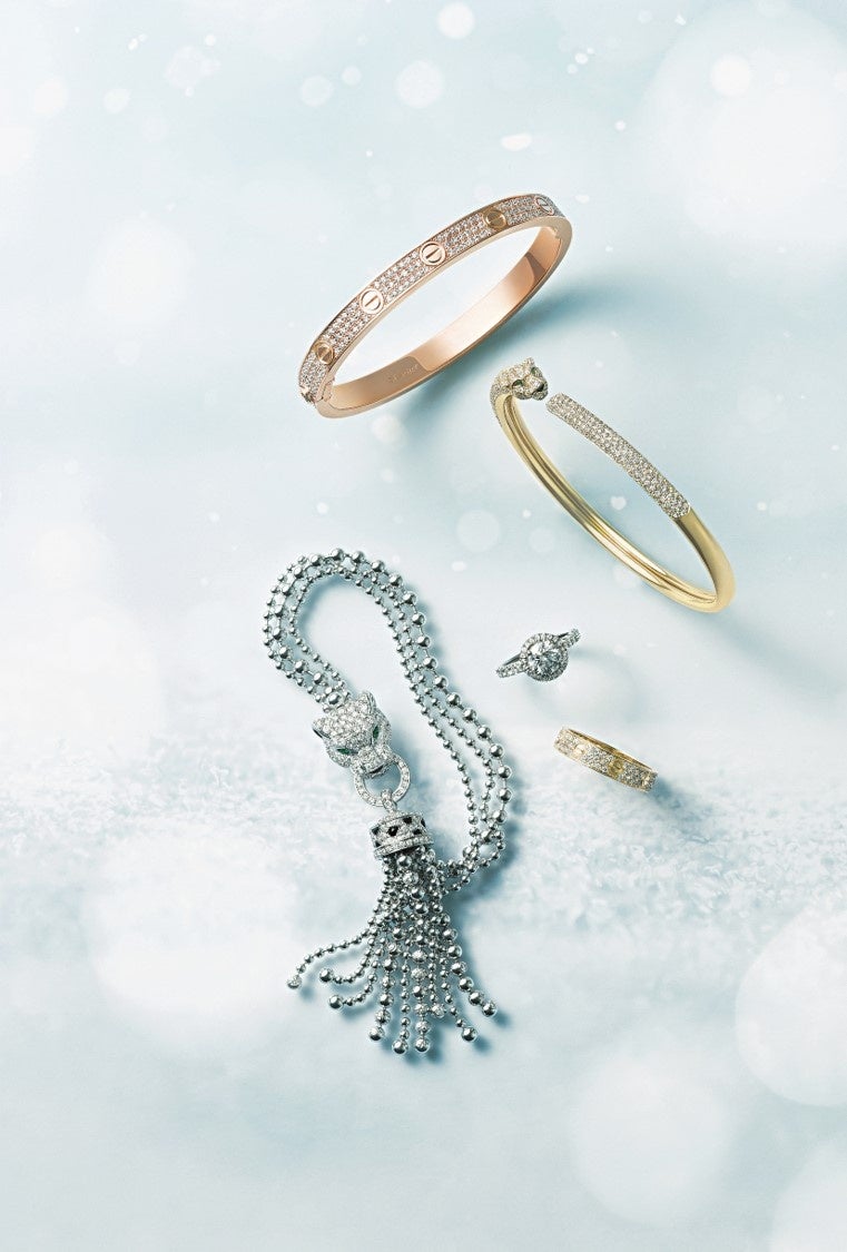 カルティエを象徴する「LOVE」、「パンテール ドゥ カルティエ」の2つのコレクションと、女性たちの永遠の憧れ「カルティエ ディスティネ」のダイヤモンド。ブレスレットとリングを重ねづけした華やかな手元は、特別なシーンで視線が集中すること請け合い。