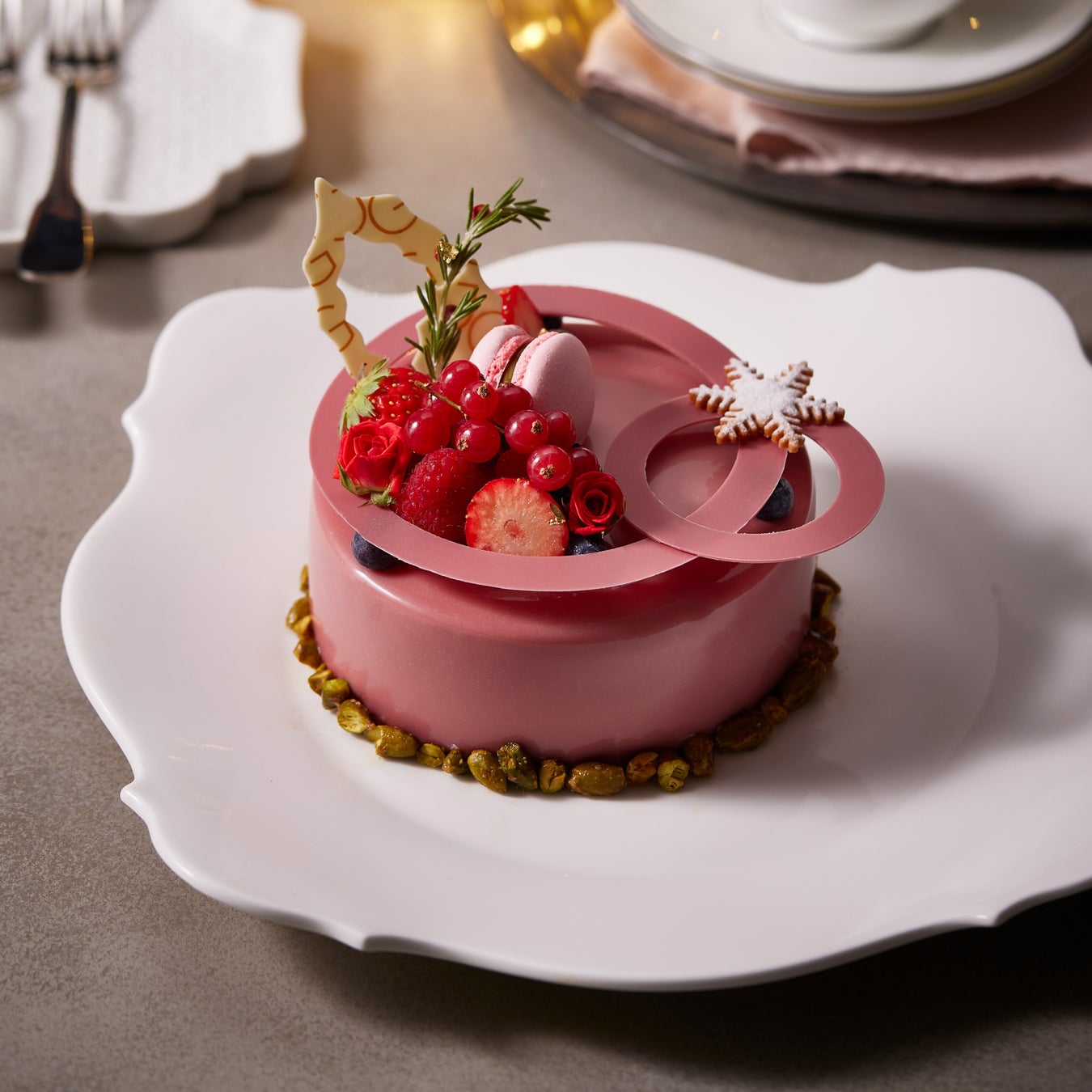 赤いフルーツやマカロン、チョコレートをトッピングした、華やかなピンク色のクリスマスケーキ。ポートワインを使ったラズベリーのムースとライチのムースのなめらかな口溶けと香りが広がる、大人のクリスマスにぴったりなケーキです。