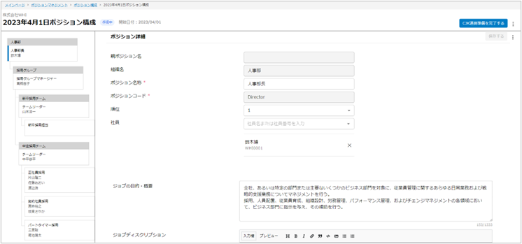 この機能により、組織と紐づけた形でポジションと職務定義を設計し、従業員のスキルや経験も同時に管理することが可能になります。さらに「COMPANY 人事・給与」で管理している組織情報と連携し、既存の組織と結び付けた効率的なポジション設定が行えます。また、ポジションに結び付く職務定義に変更が発生した際には、変更内容を「COMPANY 人事・給与」に連携することで、自動的に発令を発行し、同時に給与額へも反映することが可能となり、統合的な業務管理を実現します。
