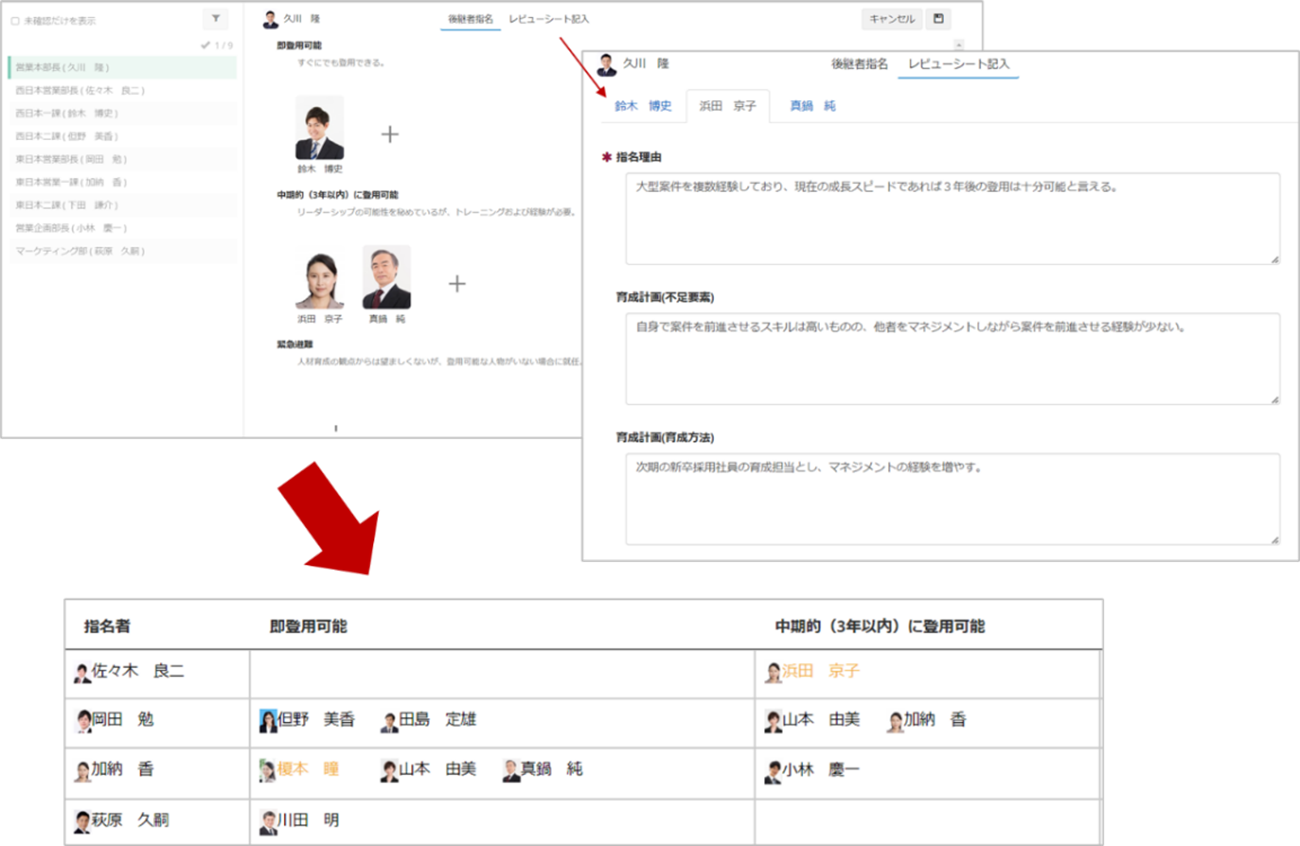 各ポジションの後継者について、計画的な育成を支援します。後継者を就任ステータスごと(すぐに就任可能、数年後に就任可能等)に指名し、それぞれの指名理由や育成計画を記録します。後継者の不足や重複等があった際には、アラート機能や調整機能で支援が可能なため、後継者不在のリスク回避に活用できます。