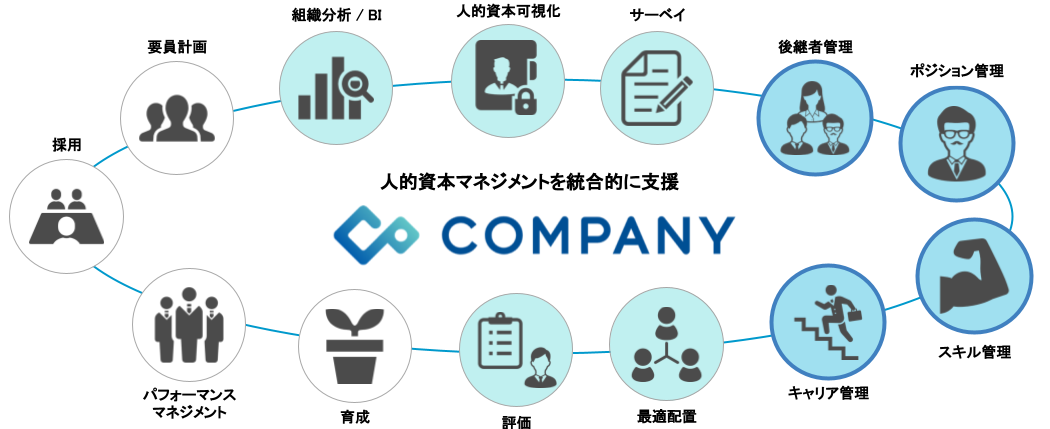 「COMPANY 人事・給与」との連携により、人事業務全体の効率化と統合的なデータ活用を実現します。「COMPANY 人事・給与」で管理されている組織情報と連携し、効率的にポジション設定が行えます。また、ポジション変更や職務定義変更が発生した際には、「COMPANY 人事・給与」と連携し、発令や給与計算に反映することができます。複雑なデータ変換と連携をリアルタイムに実現することで、人材情報を統合的に把握し、活用することが可能になります。