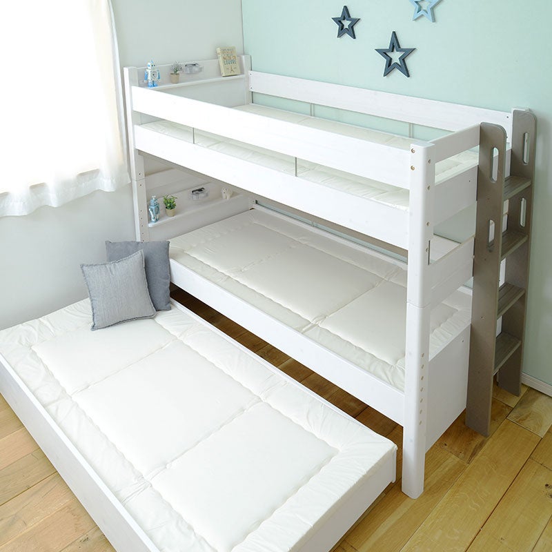 耐荷重500kgを誇る3段ベッド。特許を取得した技法で安心・安全です。上下段ともにLEDライトと2口コンセントがついており、スマホなどを置けるスペースもあります。