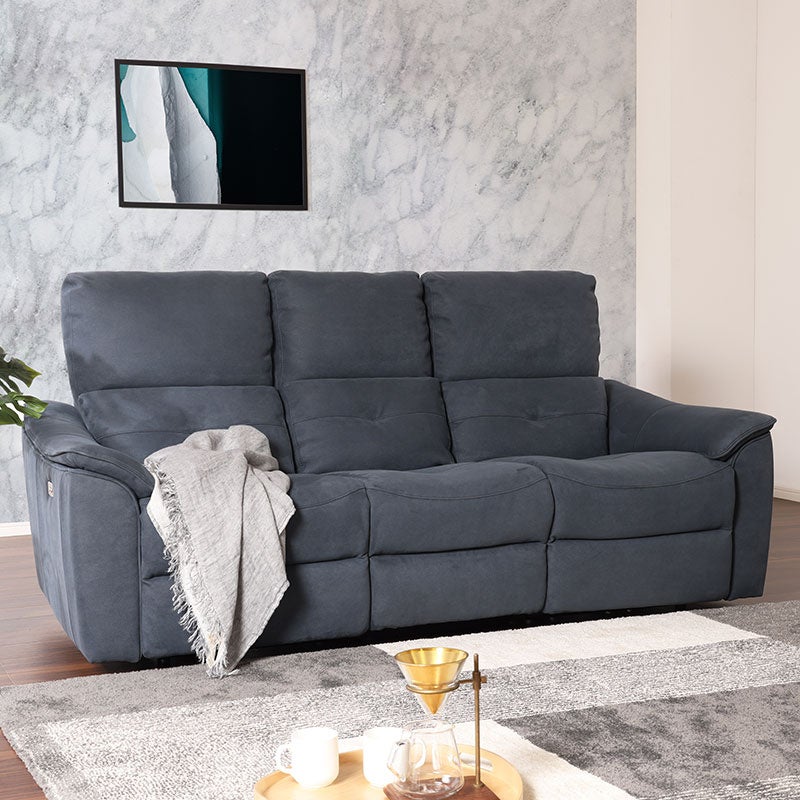 柔らかくしっとりとした肌触りが特徴の新素材プライムレザーテックスを使用した3人掛け電動リクライニングソファ。ハイバック+バケットシートで全身を包み込むような座り心地です。