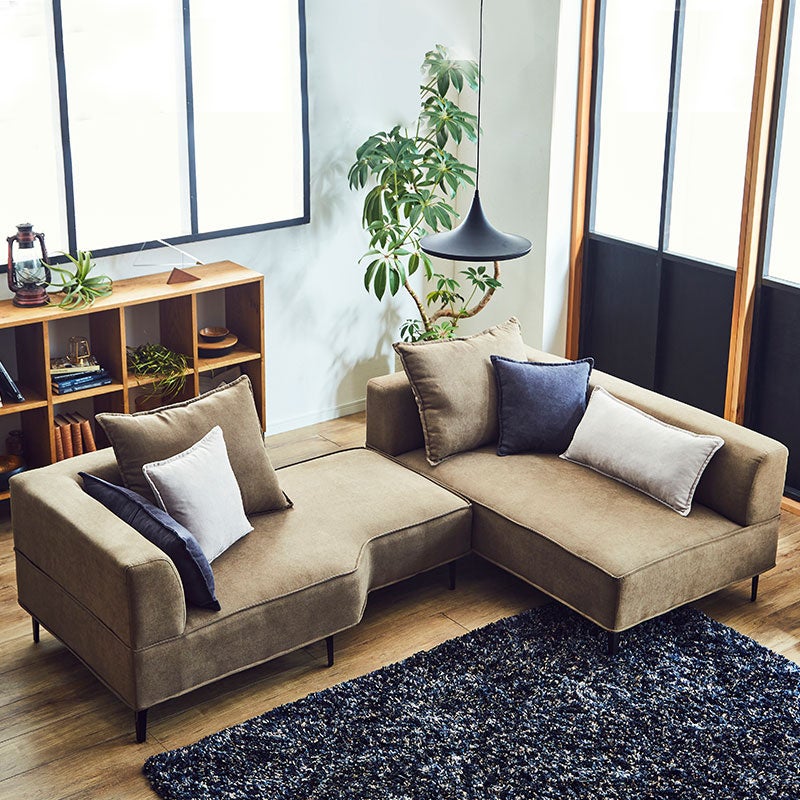 自由にスタイルチェンジ可能なカウチソファ。広々カウチスタイルに2人掛けソファ×2スタイルなど見た目の雰囲気がガラッと変わるおしゃれソファ。付属クッションは6個で使い方色々。