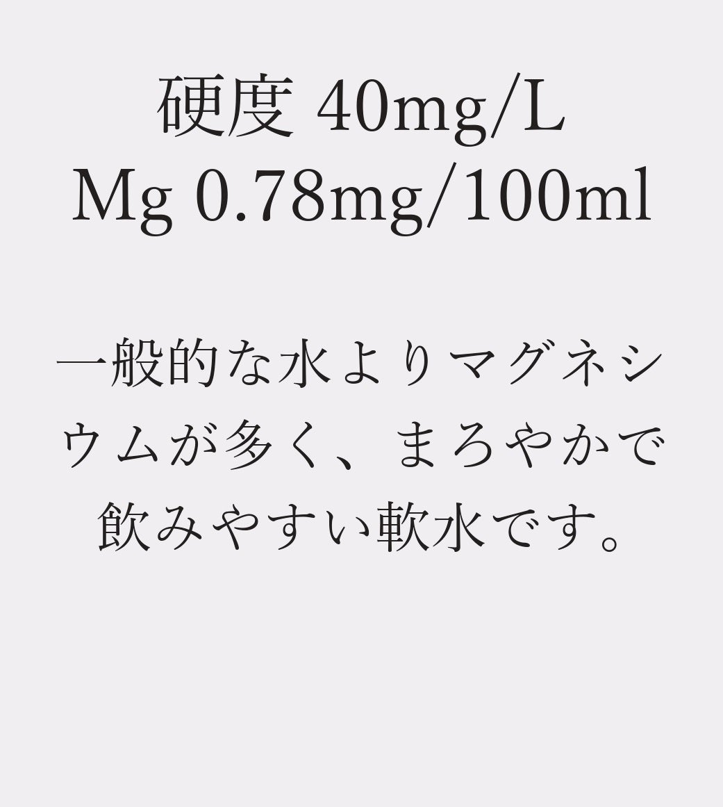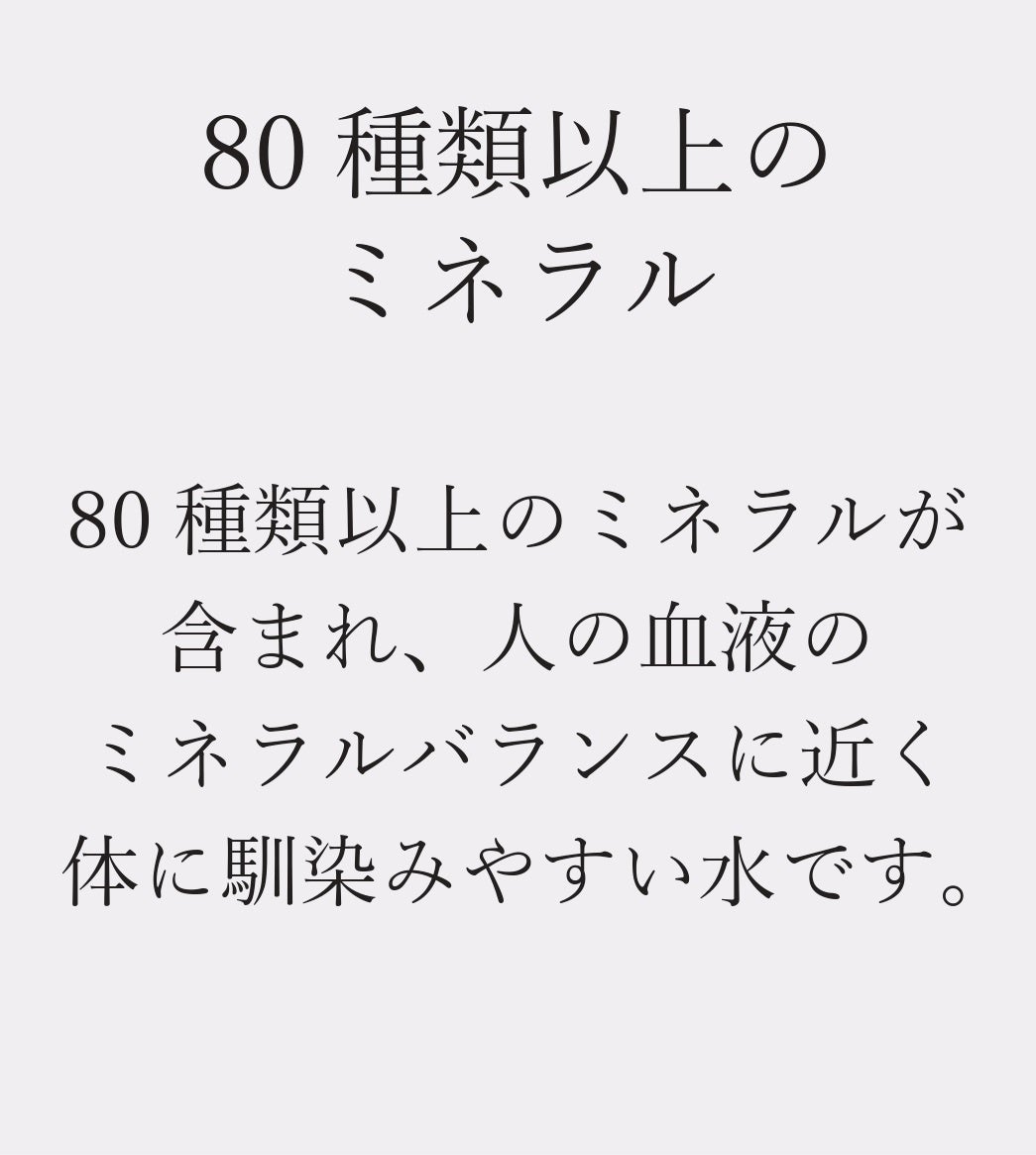 優れたミネラルバランスを備えたこの水は、細胞の活性化を助け、内側から美容と健康をサポートいたします。ナトリウムをはじめとする豊富なミネラルが、スポーツやサウナなど汗をかいた後の失われたミネラル補給にぴったり。また、まろやかで飲みやすく口当たりが良い軟水であるため、コーヒーや紅茶を淹れると、香りや味が引き立ちます。お料理の出汁や炊飯、日々の水分補給など、あらゆるシーンに適しています。
