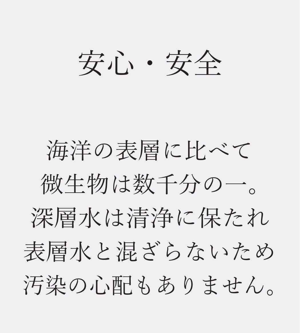 「あなたのからだに近い水」は、伊豆の深海から生まれた海洋深層水。ミネラル成分が豊富で、口にすっと染み込むような、なめらかな軟水です。 原水は、水深800mから汲み上げており、長い年月をかけて育まれた清らかな水は、現代人の健やかな暮らしを支え、毎日の水分補給に確かな安心をお届けいたします。