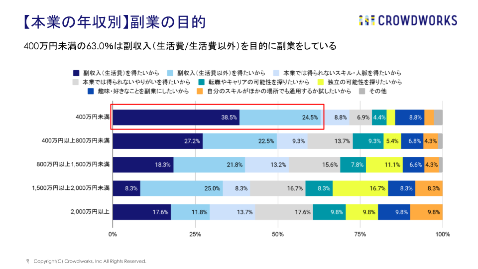 本業の年収別で副業を行っている割合を見ると、年収400万円未満が56.0%と多く、一方年収1,000万円以上で副業を行っている割合は9.5%でした。また、本業の年収別に副業実施割合を見ると、年収400万円未満の副業ワーカーのうち63.0%が生活費などの副収入を目的としており、本業収入の補填として副業をしていることが推察されます。