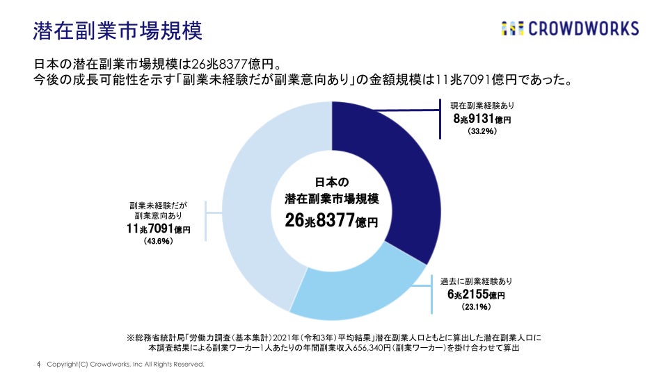 事業所の副業容認や副業ワーカーを採用している企業の増加を背景として潜在副業市場規模(*)も拡大し、現在の国内での潜在副業市場規模は推計26兆8377億円にのぼることがわかりました。