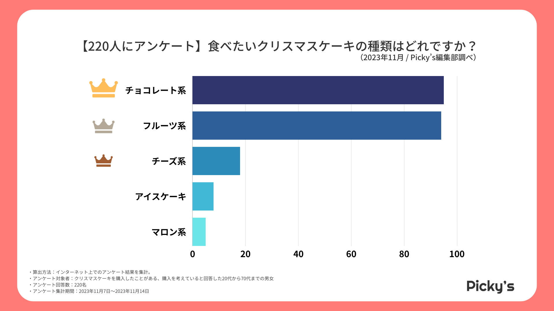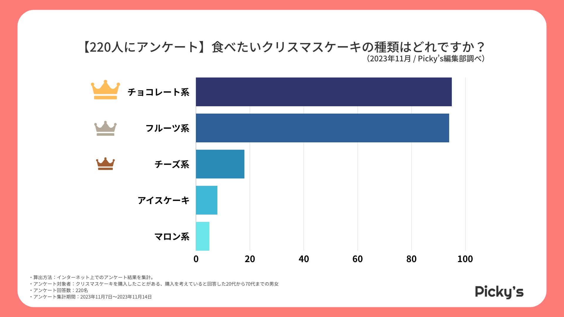 「Picky’s」は、インターネットショッピングにおいて、購入前に試せない・選ぶべきものがわからないという課題の解決を目標に、あらゆる商品のおすすめランキングや検証レビューを紹介するサイトです。このたびPicky’s(https://rentry.jp/note/)では、季節プレゼントに先駆けて、クリスマスケーキに関してインターネット上でアンケート調査を行いましたので発表いたします。
