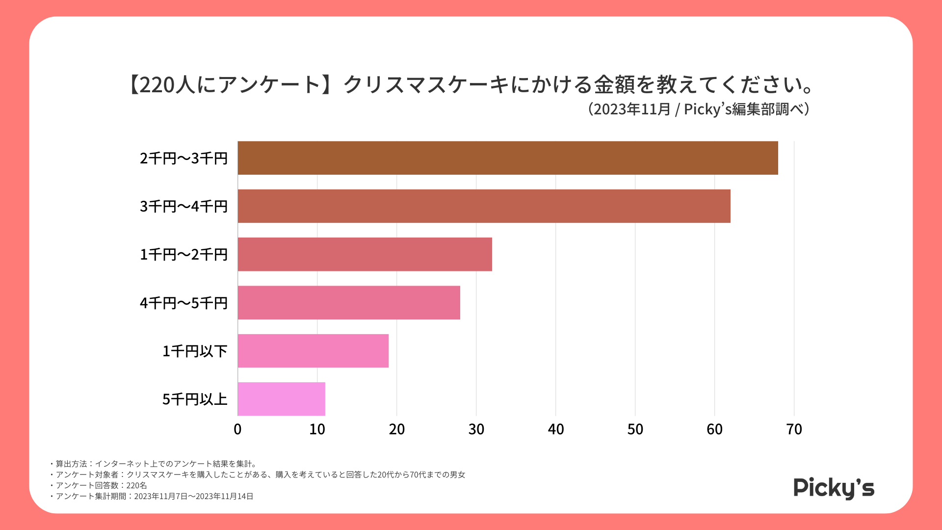 このアンケート結果からクリスマスケーキにかける金額は幅広く、様々な予算に合わせて選択されていることがわかりました。1位「2千円~3千円」、2位「3千円~4千円」の価格帯が特に人気であり、手頃な価格でクリスマスを楽しんでいるようです。3位以下もそれぞれ異なるニーズを反映しており、予算やケーキに求める価値によって選ばれる傾向が見受けられます。