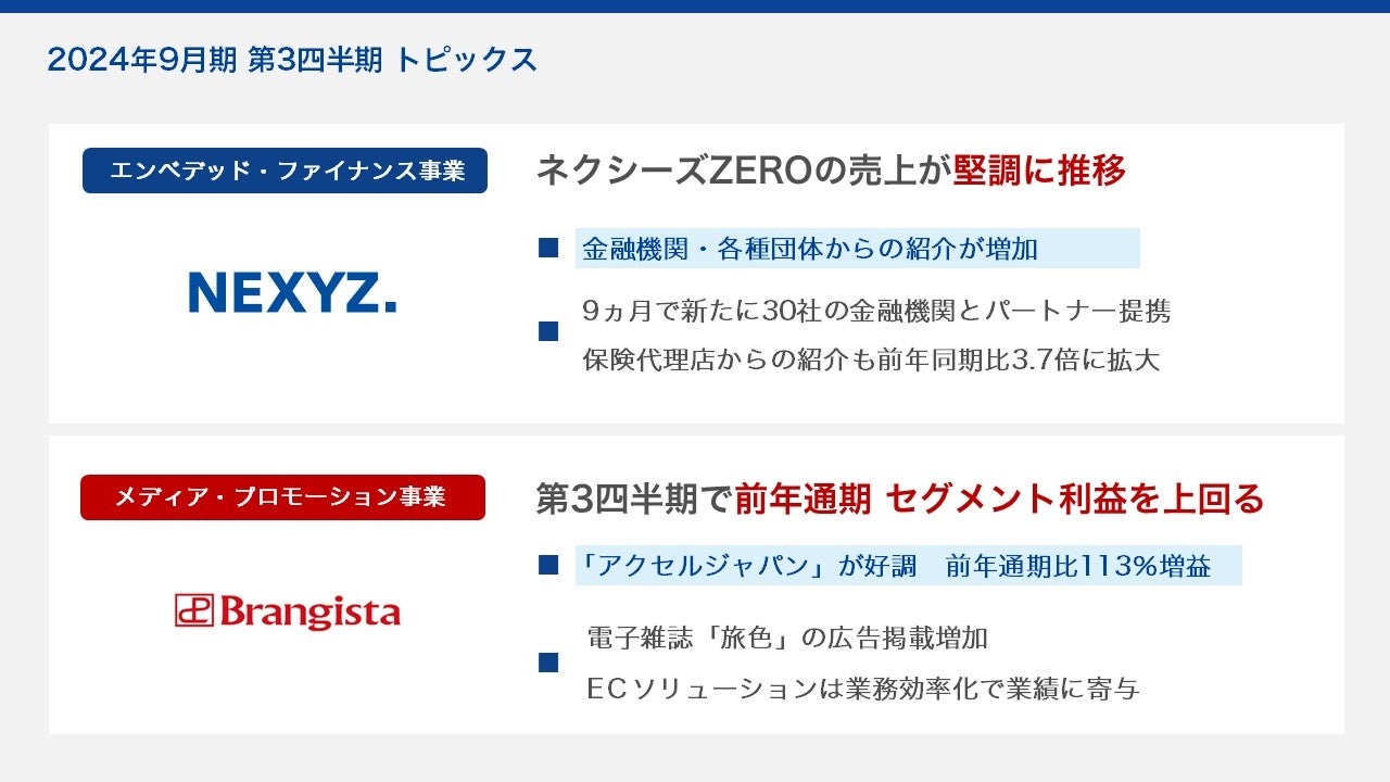 メディア・プロモーション事業は、アクセルジャパンの好調により当第3四半期連結終了の時点で、2023年9月期通期の利益を上回る好業績となっております。