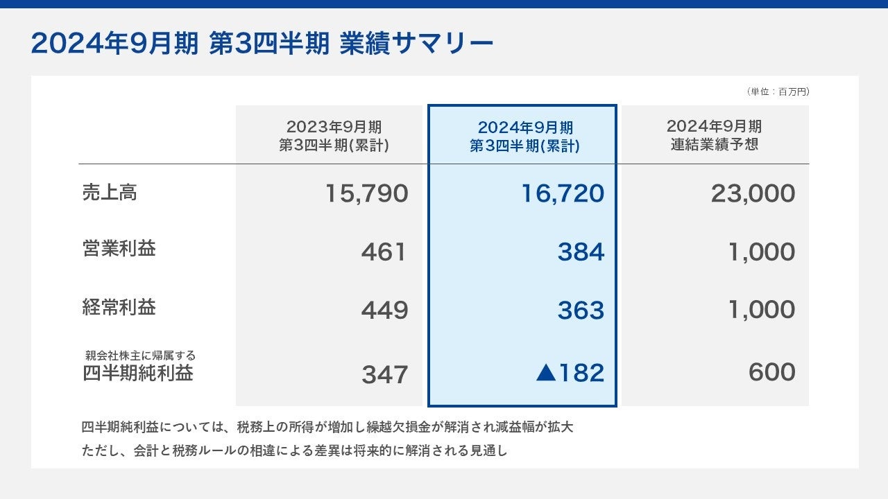 2024年9月期第3四半期連結業績は、売上高16,720百万円、営業利益384百万円、経常利益363百万円となり、親会社株主に帰属する四半期純損失は182百万円となりました。
