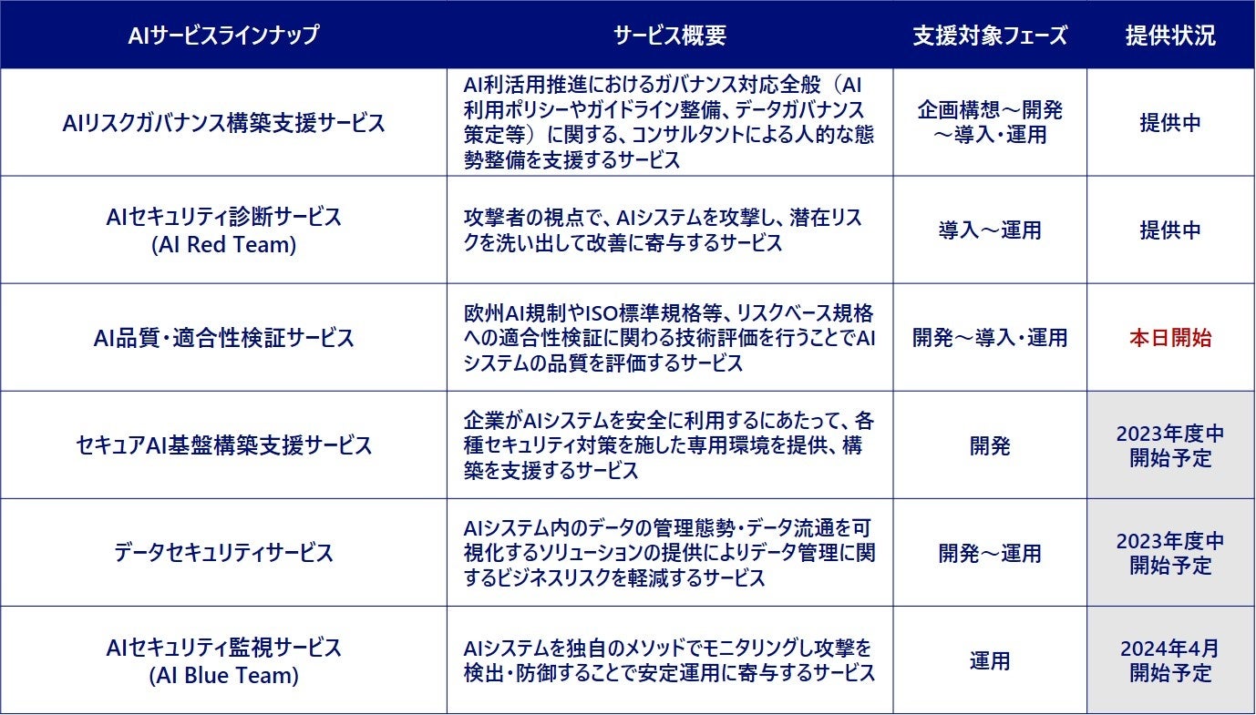 NRIセキュアが提供するAIセキュリティ関連サービスについては、次のWebサイトおよび一覧表をご参照ください。https://www.nri-secure.co.jp/service/ai-security