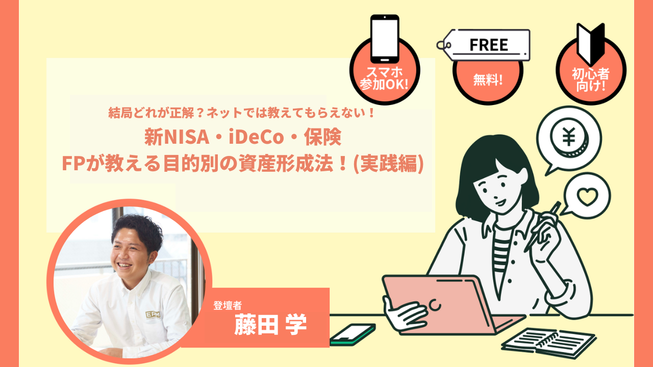 当日は、FP兼、IFA(独立系ファイナンシャルアドバイザー)として、「相談・現状把握~課題解決策として実際の金融商品(保険・証券)のご提案、実行フォロー」を一貫してご提供している講師の藤田 学様を迎えて「新NISA・iDeCo・保険 FPが教える目的別の資産形成法!(実践編)」に関するオンラインセミナーを実施いたしました。