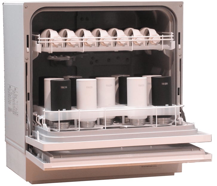 食洗機事業で培った洗浄ノウハウを生かし、実証実験用に2種類の洗浄機を開発しました。高速ボトル洗浄機は、新開発ノズルによる高圧水流と高温水により、1回およそ1分でボトル内部とフタを同時洗浄、手間なくクリーンな洗いあがりを実現します。既存の卓上食洗機を改良した卓上型ボトル洗浄機は複数のマイボトルの同時洗浄と乾燥が可能なほか、洗浄後は「ナノイーX」により清潔に保管できます。