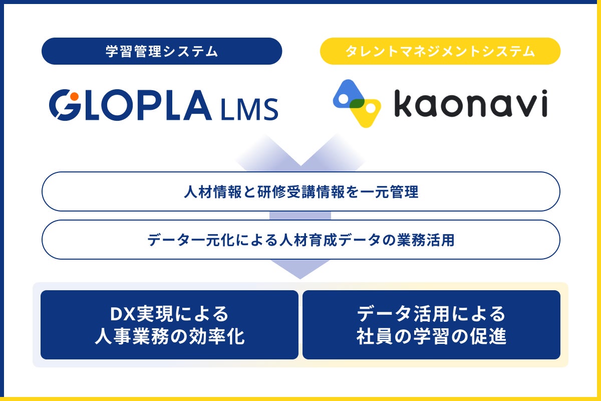 株式会社グロービス(東京都千代田区、代表取締役:堀義人)が提供する学習管理システム「GLOPLA LMS(Learning Management System)」(https://glopla.globis.co.jp)は、株式会社カオナビ(本社:東京渋谷区、代表取締役社長 Co-CEO:佐藤 寛之氏、以下カオナビ)が提供するタレントマネジメントシステム「カオナビ」とのAPI連携を開始しました。今回のAPI連携により、「カオナビ」に登録されている人材情報を、「GLOPLA LMS」へ取り込むことが可能となります。それぞれが持つ研修受講情報と人材情報を一元管理することで人事業務の効率化を実現し、さらに人事・教育担当者のデータ活用を促進することで、企業の人的資本経営、リスキリングの推進を支援します。