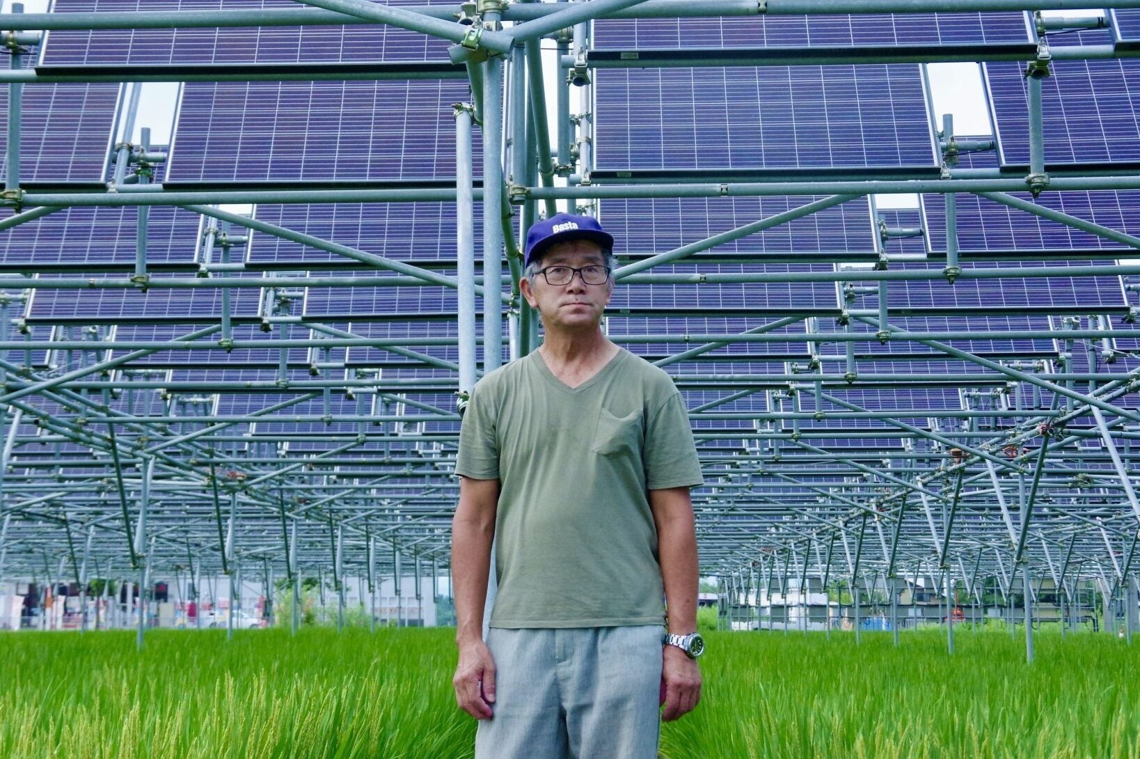 ご自宅の敷地内、かつて牛舎があったという土地には、数多くのソーラーパネルが円形に並びます。こちらは太陽の位置を自動で追尾するシステムになっており、時間の経過とともにソーラーパネルの傾斜が変わる圧巻の仕組みです。田んぼでは、青々と育つ稲の真上にびっしりとソーラーパネルが配置されていました。見慣れない光景が広がり、周囲と比べても一際目を引きます。