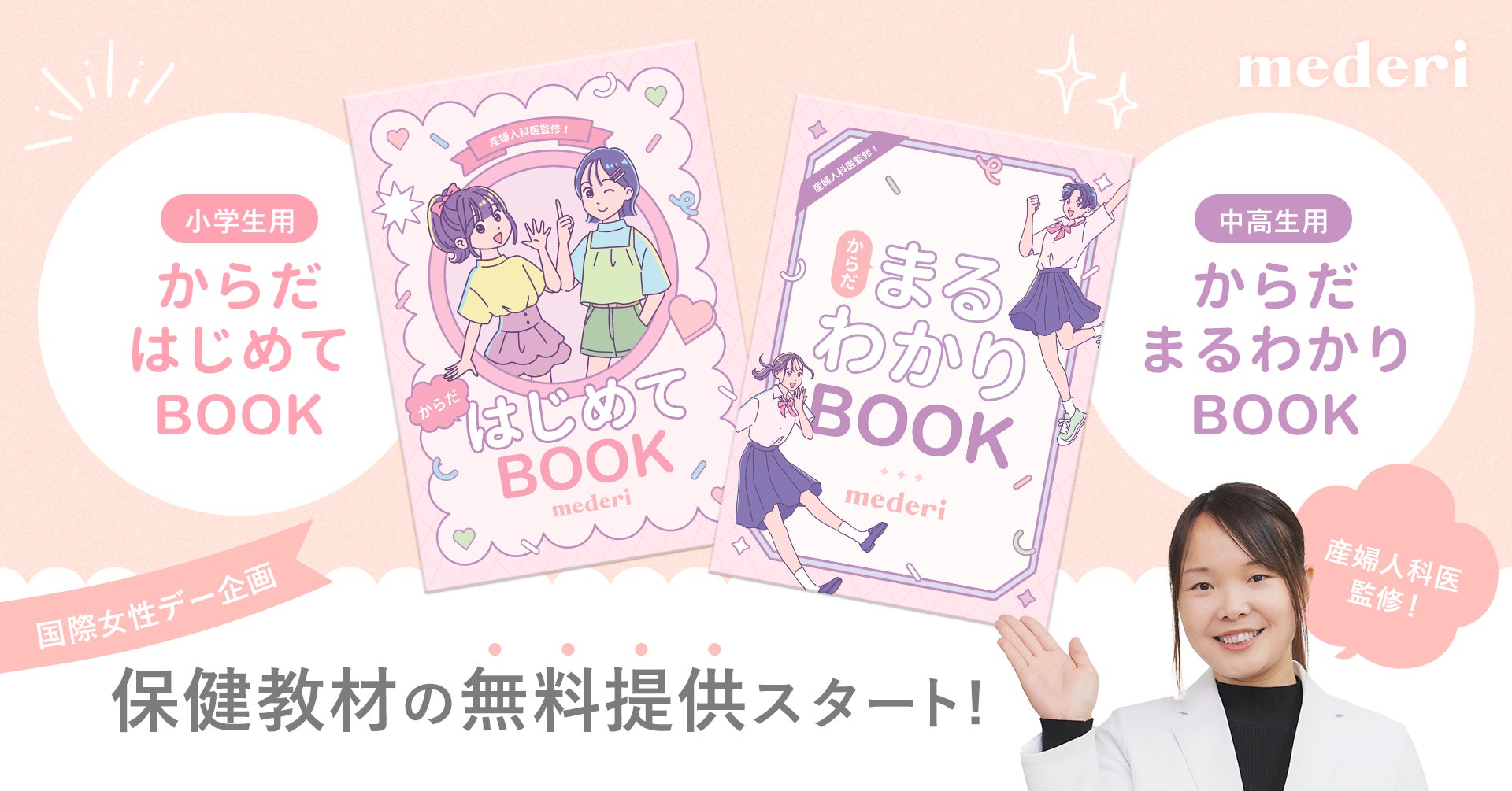 オンラインピル診療サービス『mederi Pill(メデリピル)』を提供するmederi株式会社(本社:東京都目黒区、代表取締役 坂梨 亜里咲 以下、mederi)は、3月8日の国際女性デーに合わせて、産婦人科医が監修した保健教材 小学生用「からだ はじめてBOOK」、中高生用「からだ まるわかりBOOK」を2025年3月3日(月)より無料提供を開始します。