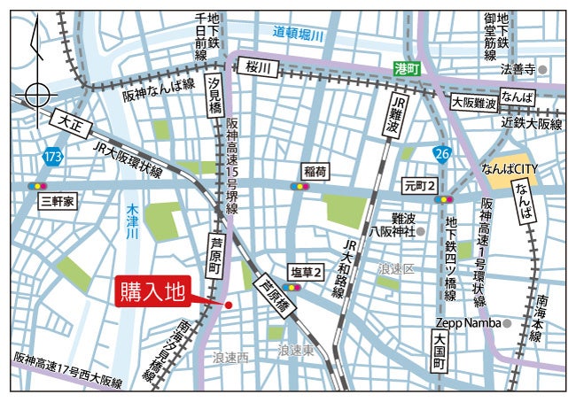 購入地はJR大阪環状線「芦原橋」駅南出口から徒歩3分、南海電鉄「芦原町」駅から徒歩4分の立地であり、JR「大阪」駅までは直通13分、JR「天王寺」駅まで直通5分です。