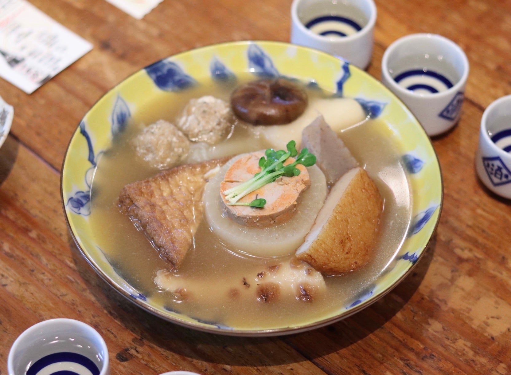 "鯛出汁"、あん肝大根、ちくわ、卵、さつま揚げ、京がんも、こんにゃく、厚揚げ、椎茸