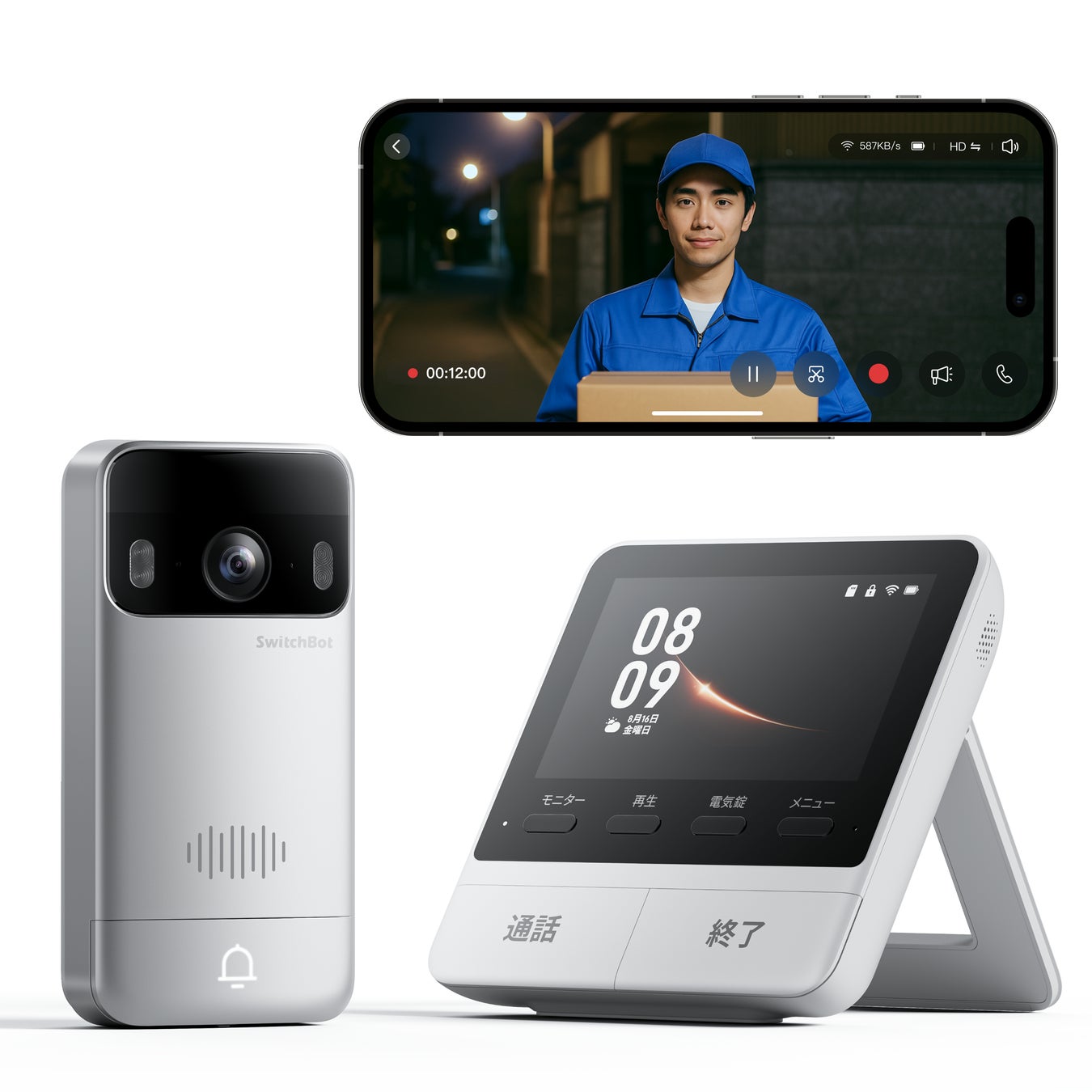 家ではモニター、外ではスマホから来客対応できるスマートドアホン。300万画素(*1)の高画質&165°広角レンズで、訪問者の顔から足元までしっかり映し出します。インターホン子機は貼るだけの簡単設置、約2年8カ月充電不要(*2)。SwitchBotロック製品と連携すれば、モニターやスマホからドアの解錠も可能。