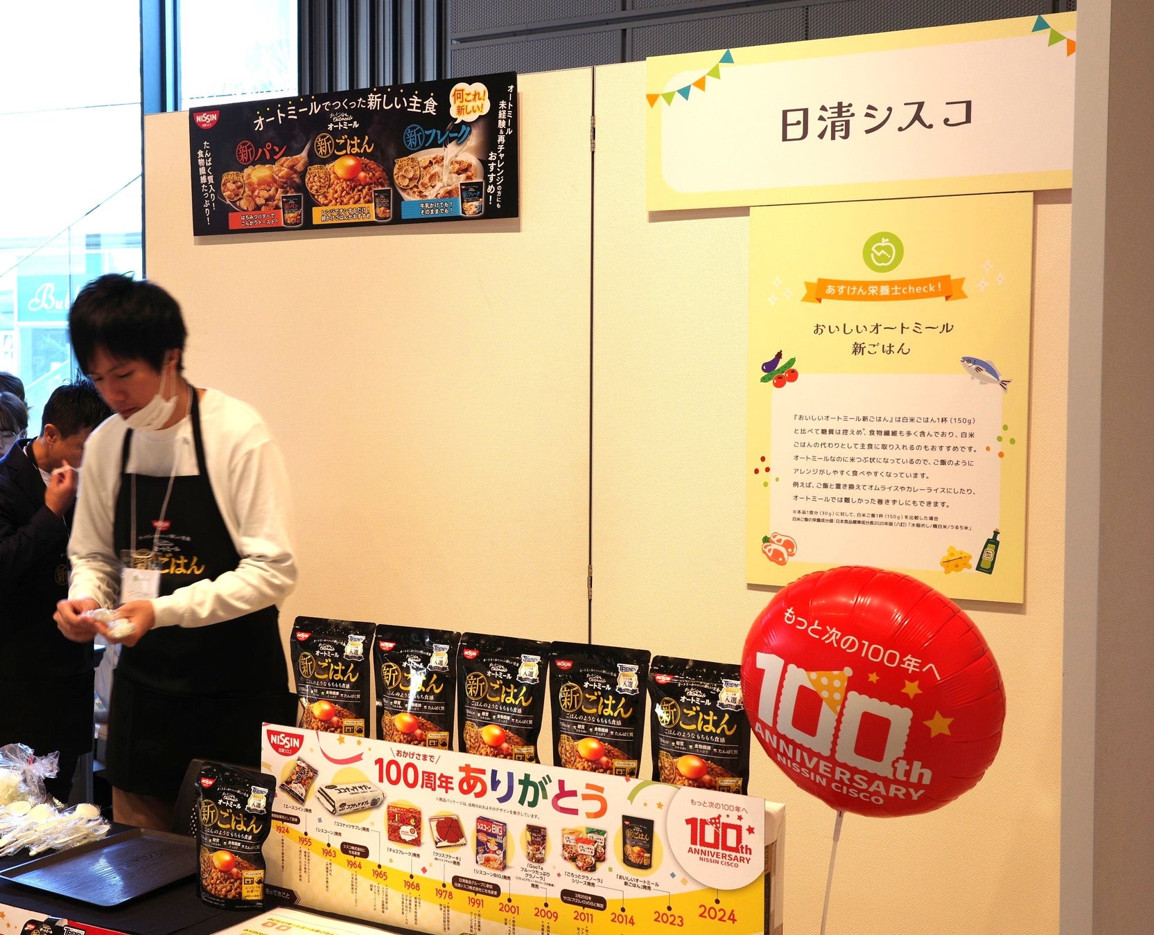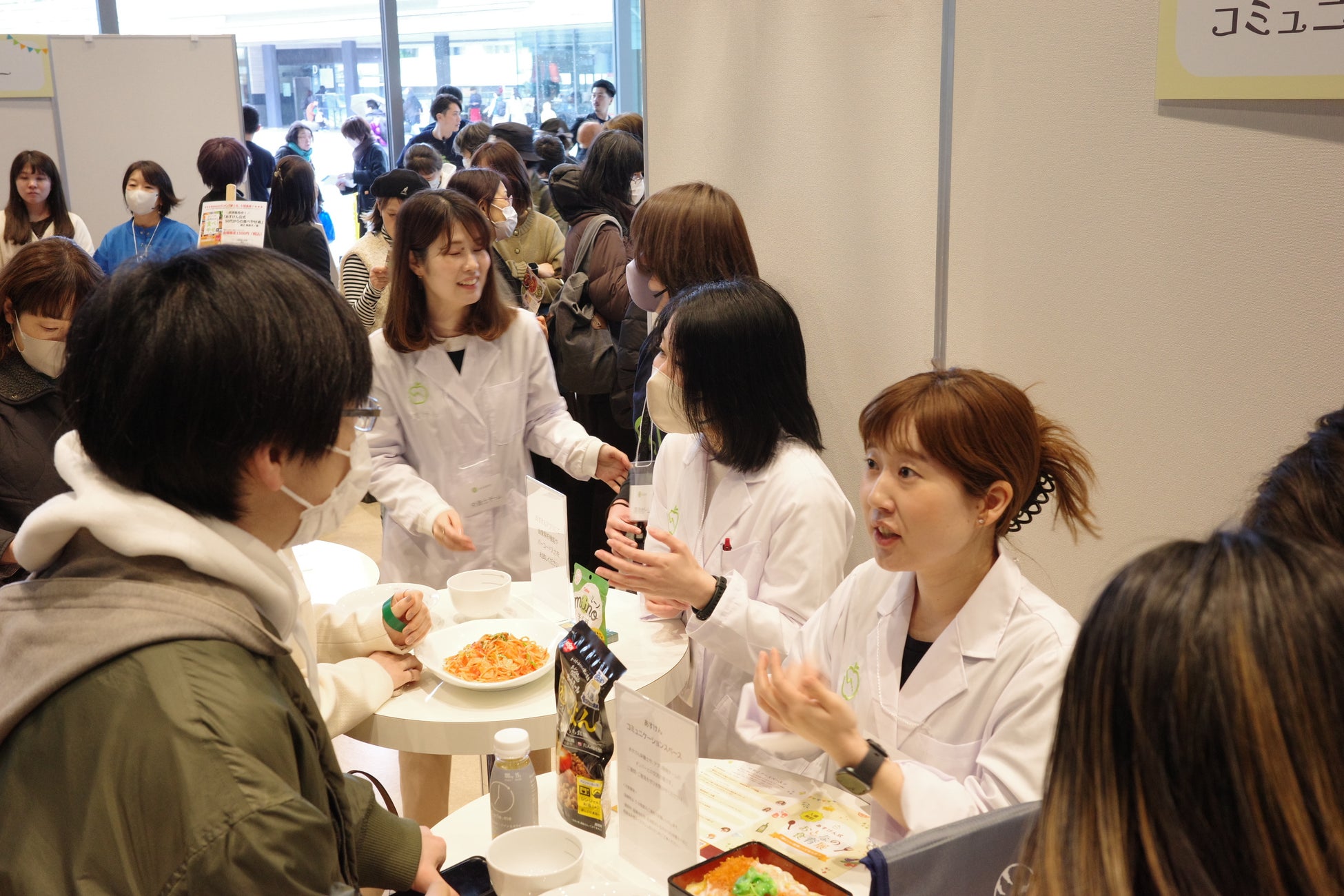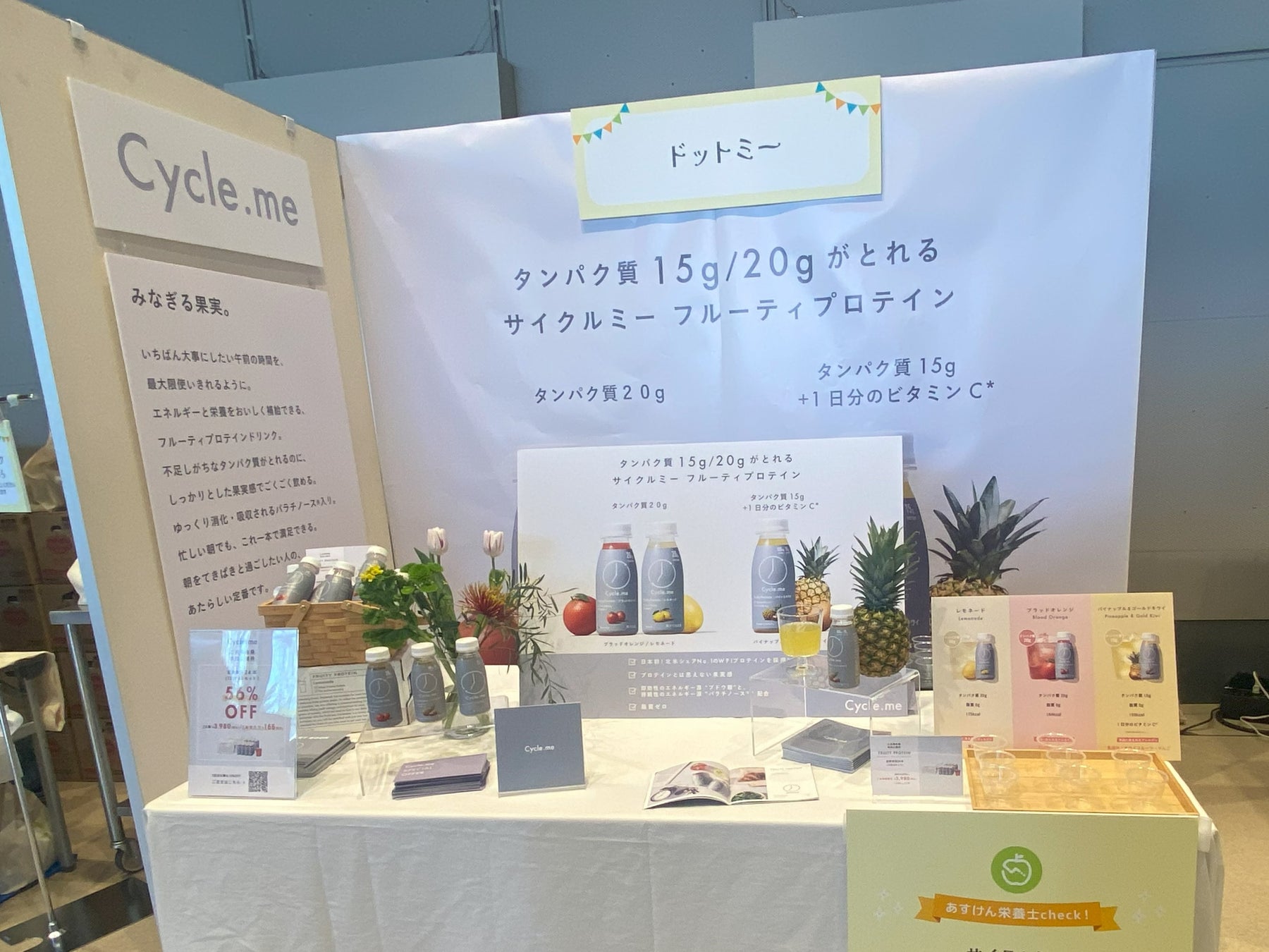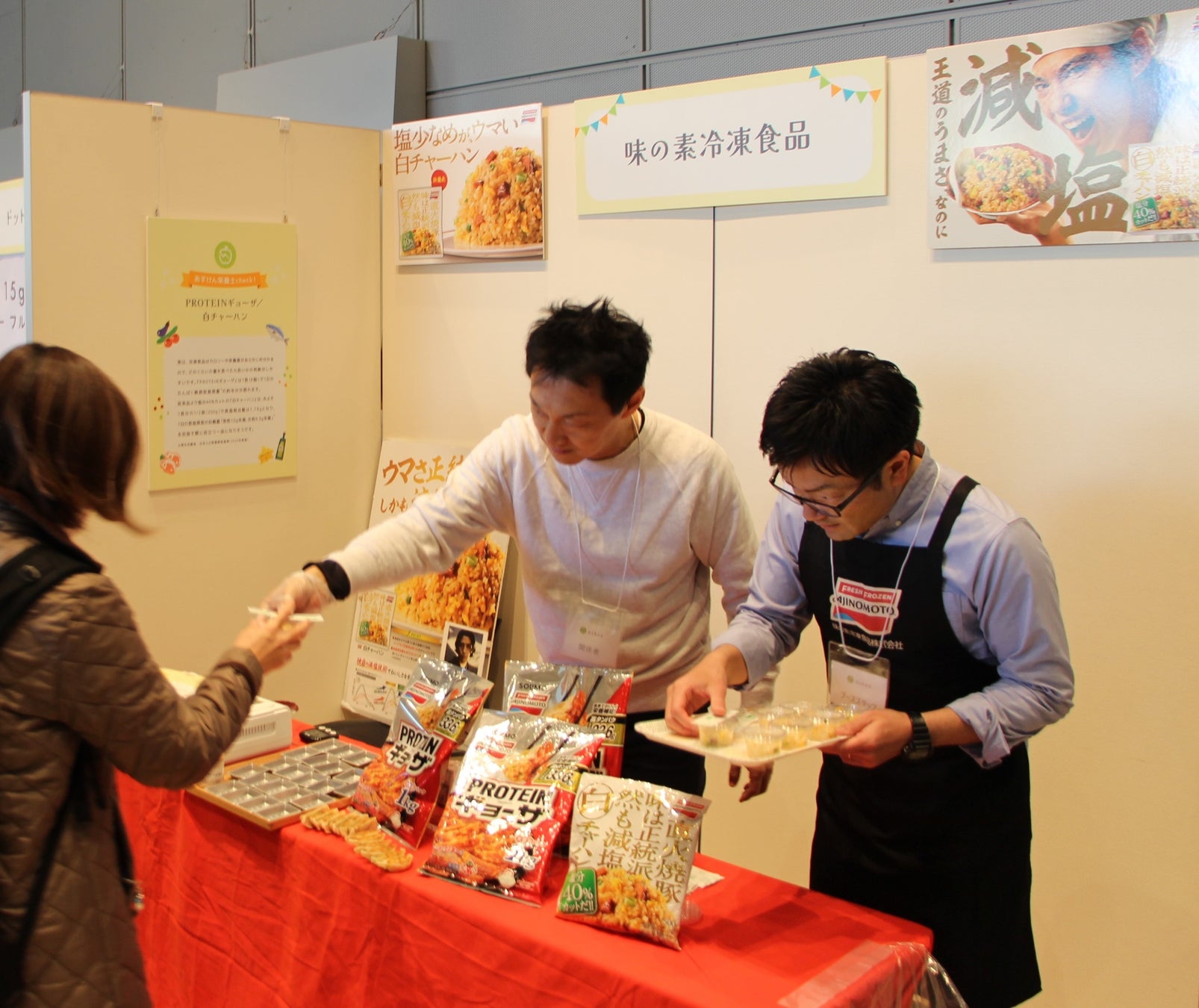 企業ブースでは、各社がおすすめする製品の試食・試飲が行われました。PROTEINギョーザ・白チャーハン(味の素冷凍食品)、野菜生活100 Smoothie(カゴメ)、スープシリーズ(Greenspoon)、おいしいオートミール新ごはん(日清シスコ)、サイクルミーフルーティプロテイン(ドットミー)をお試しいただきました。