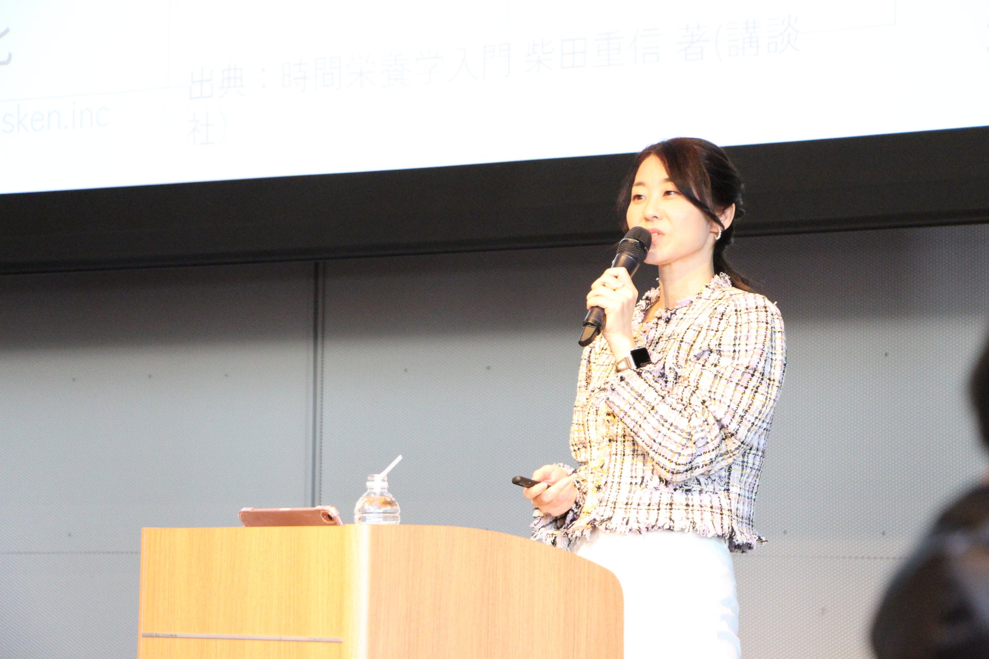 『あすけん』アプリの創業メンバーで管理栄養士の道江が、「何をどのくらいたべるか」に加えて「いつ食べるか」を考慮した「時間栄養学」をテーマにした講演をいたしました。時間栄養学のキーワードである「体内時計」「食事時間」「朝食」を切り口に、生活リズムのタイプや、理想的な食事のタイムライン、食べ物の栄養素が、摂取した時間帯で体に異なる影響を及ぼすことなど、時間栄養学の研究結果を交えながらこれまでの食事管理に新しい視点をもたらすトピックスを皆さまと共有いたしました。