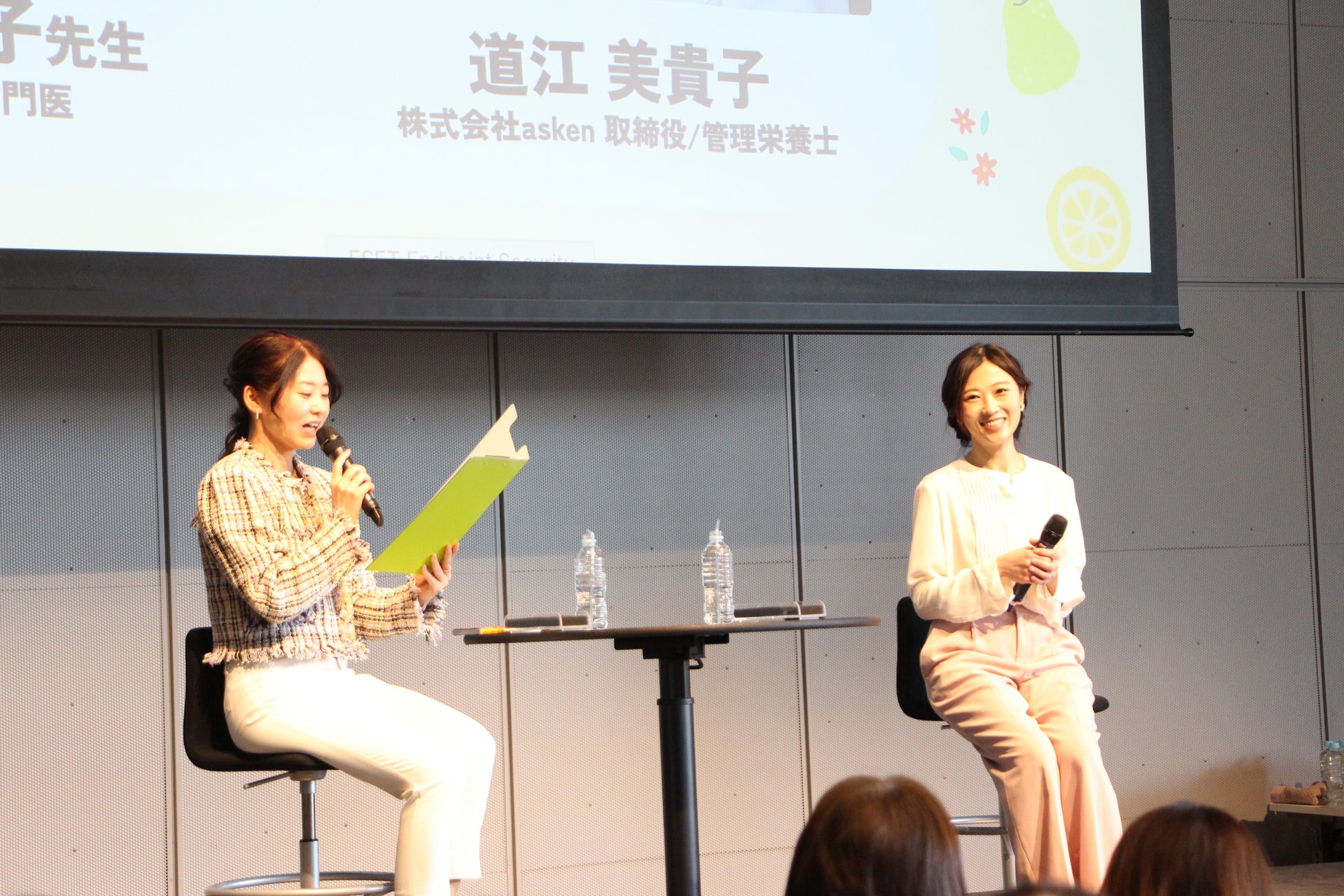 対談セミナーでは、女性の健康と食生活をテーマに、産婦人科専門医の三輪先生にご講演いただき、道江と対談形式のセミナーを実施いたしました。現代女性はライフステージの変化にともなう女性ホルモンの分泌量の変化や、閉経後の寿命の延伸などにより、月経に関連する疾患や妊娠・出産における課題、更年期障害といった健康課題を感じる機会が増えています。健康的に一生を過ごすため、三輪先生のご経験の中で得た対処方法や摂ると良い栄養素などすぐに役立つ情報がたくさんのセミナーとなりました。