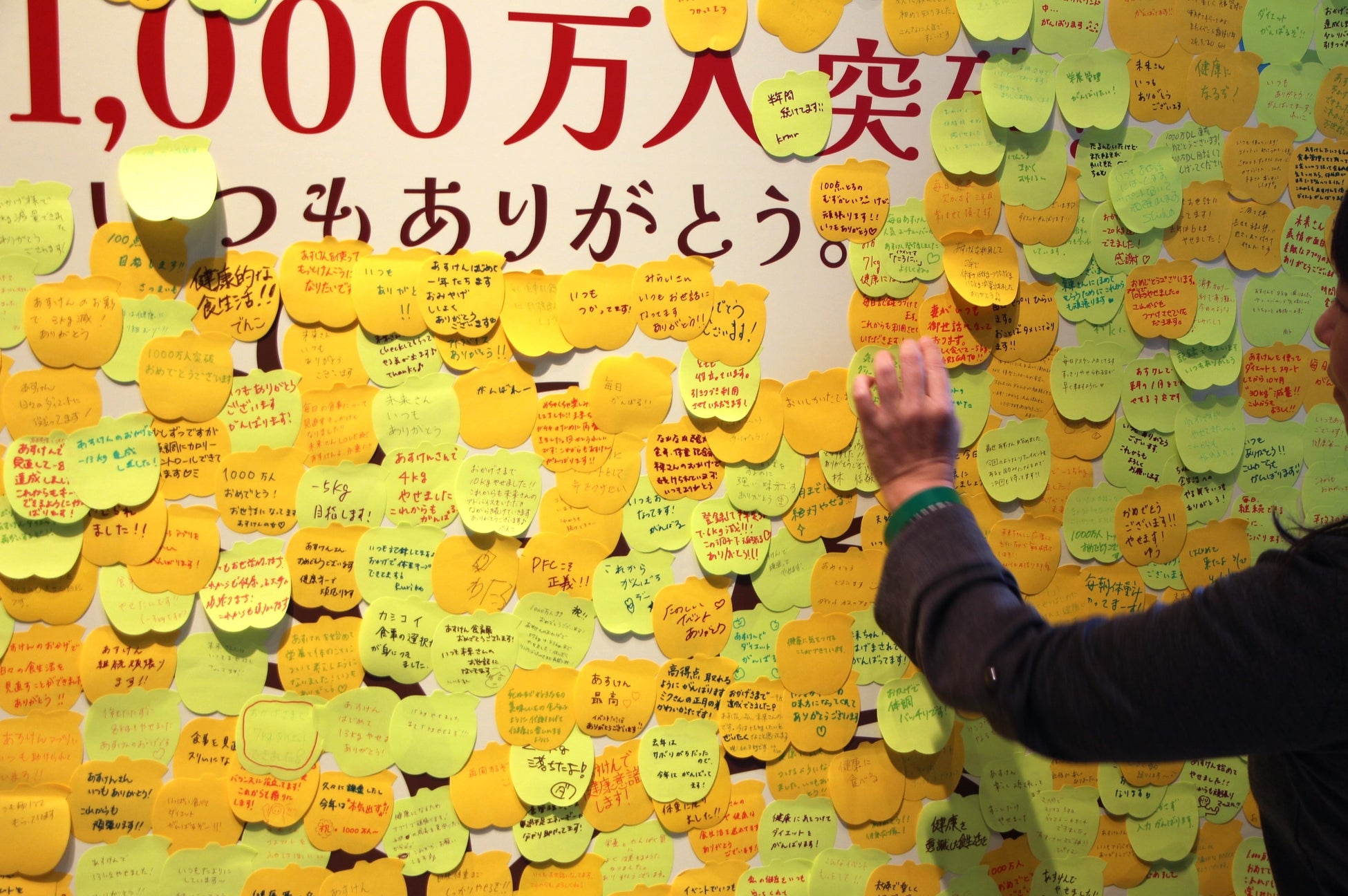 会場入り口のフォトコーナーにはAI栄養士キャラクターの未来さんのパネルを設置、一緒に記念撮影をしてくださるお客様が数多くいらっしゃいました。累計会員数1000万人を突破した記念のメッセージボードには、500枚を超えるコメントが寄せられました。