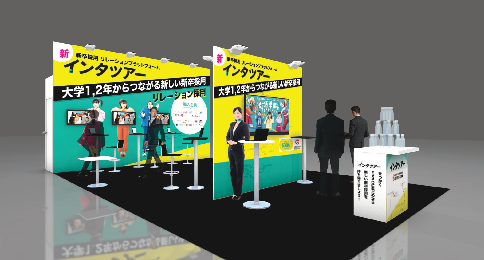 出展ブースでは、大学1,2年生が企業へインタビューを行うなどして接点を持つ新しい新卒採用サービス「インタツアー」について分かりやすく紹介します。そのほか様々な体験や特典を用意し、採用に悩みを抱える企業の課題解決の提案を行います。
