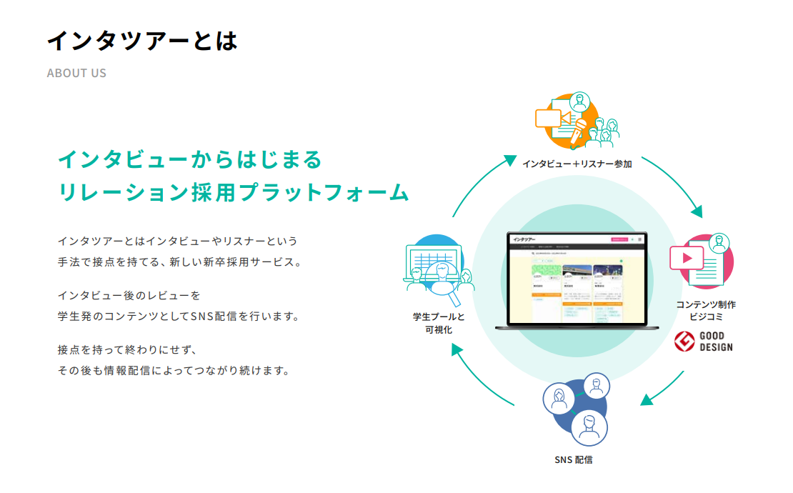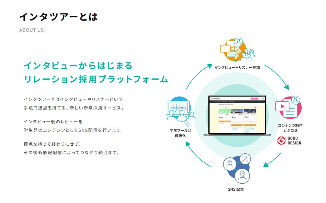 事業内容:インタビューからはじまるリレーション採用プラットフォーム「インタツアー」を展開。学生と企業の新しいタイミングで新しいつながり方の採用マーケティング機能で新卒採用支援を行っている。