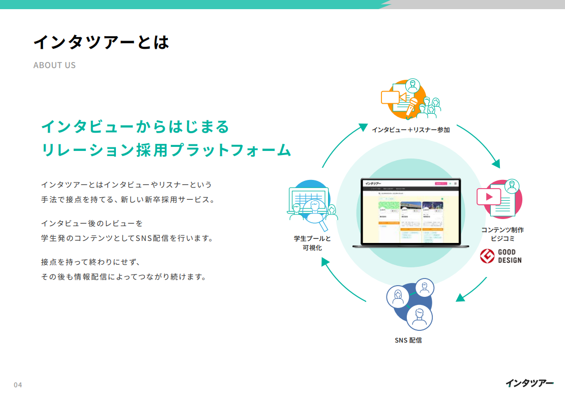①知名度不足 ②自社の魅力が伝わらない ③辞退率が高い そんな新卒採用"負の歴史"をインタツアーが終わらせます。インタビューから始まる"リレーション採用"プラットフォームで学生との新しいつながり方を提供。新卒採用支援サービス"インタツアー"をご体感ください。