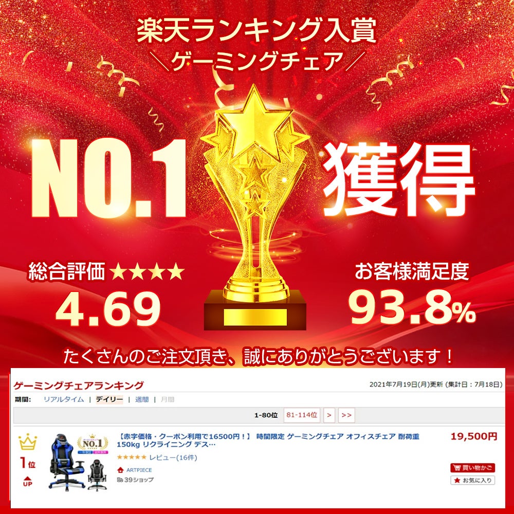 「JPRACING」ゲーミングチェアはおかげさまで、ヤフーショッピング・楽天市場に、多くのユ一ザ一様よりたくさんの高評価を頂いた、更に、オフィスチェアランキングに1位常連!
