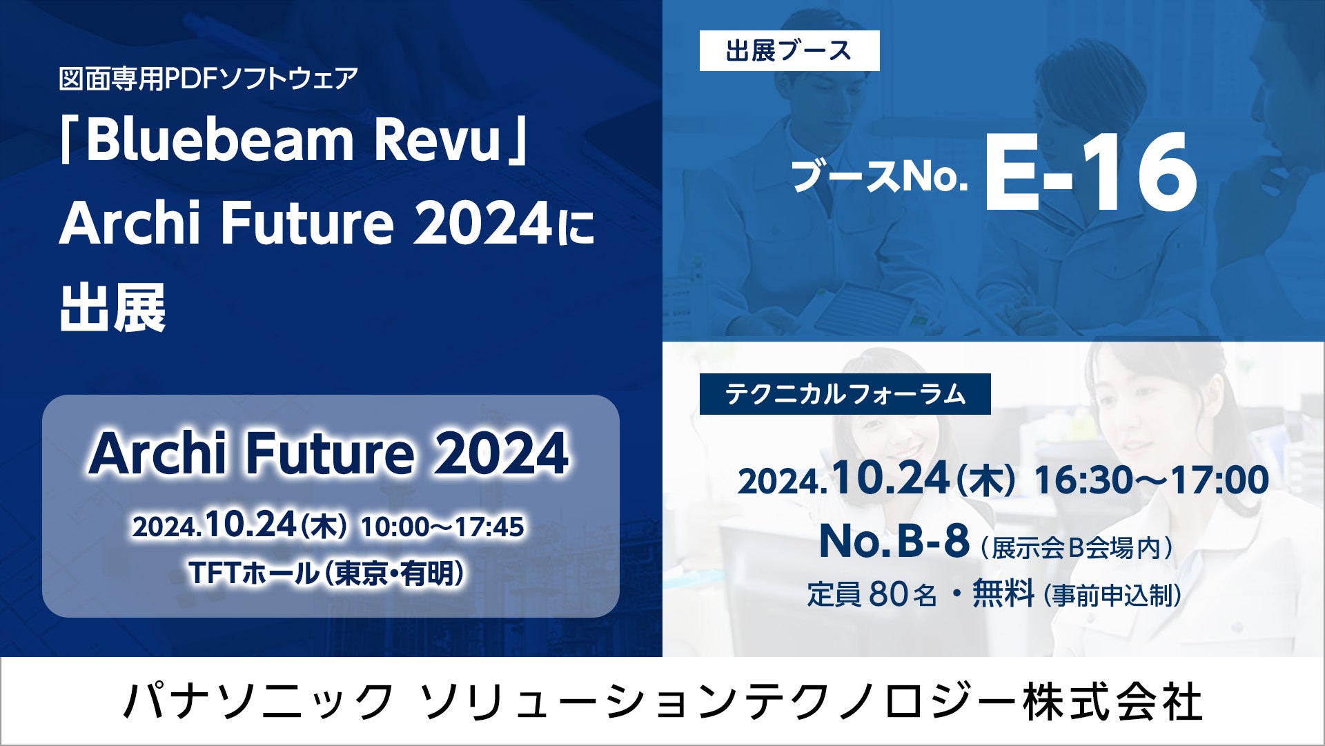 パナソニック ソリューションテクノロジー株式会社(本社:東京都、代表取締役社長:伊藤 一義/以下、パナソニック)は、2024年10月24日(木)にTFTホール(東京・有明)にて開催される「Archi Future 2024」(主催:Archi Future 実行委員会)に図面専用PDFソフトウェア「Bluebeam Revu」を出展します。ブースでは実際に「Bluebeam Revu」が体験できます。また、会場内のテクニカルフォーラムでは、Bluebeam社によるグローバル事例をご紹介します。