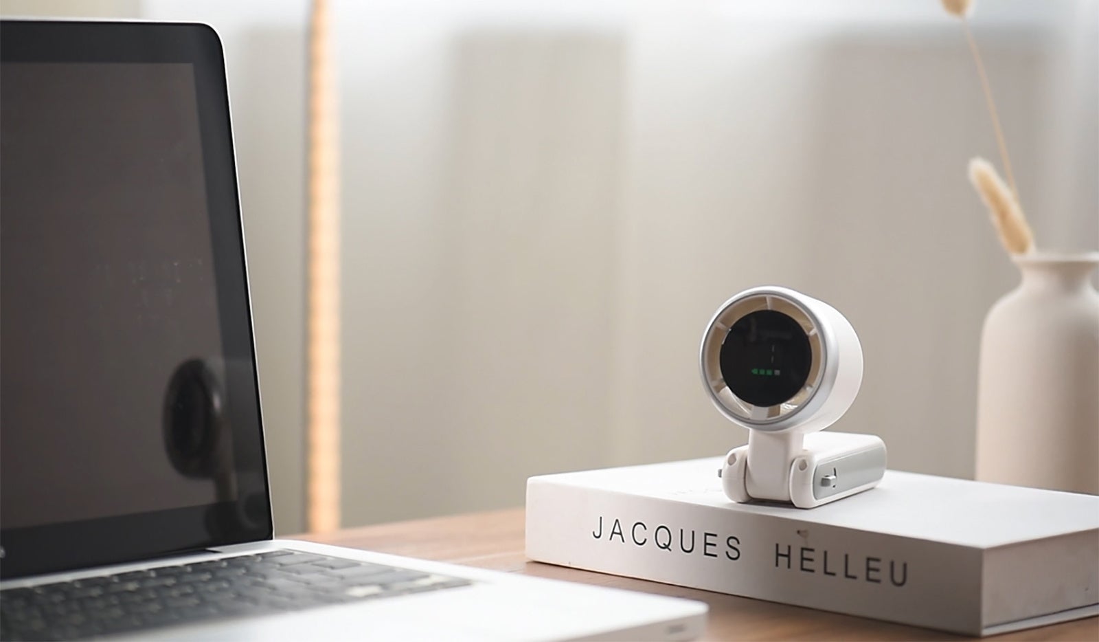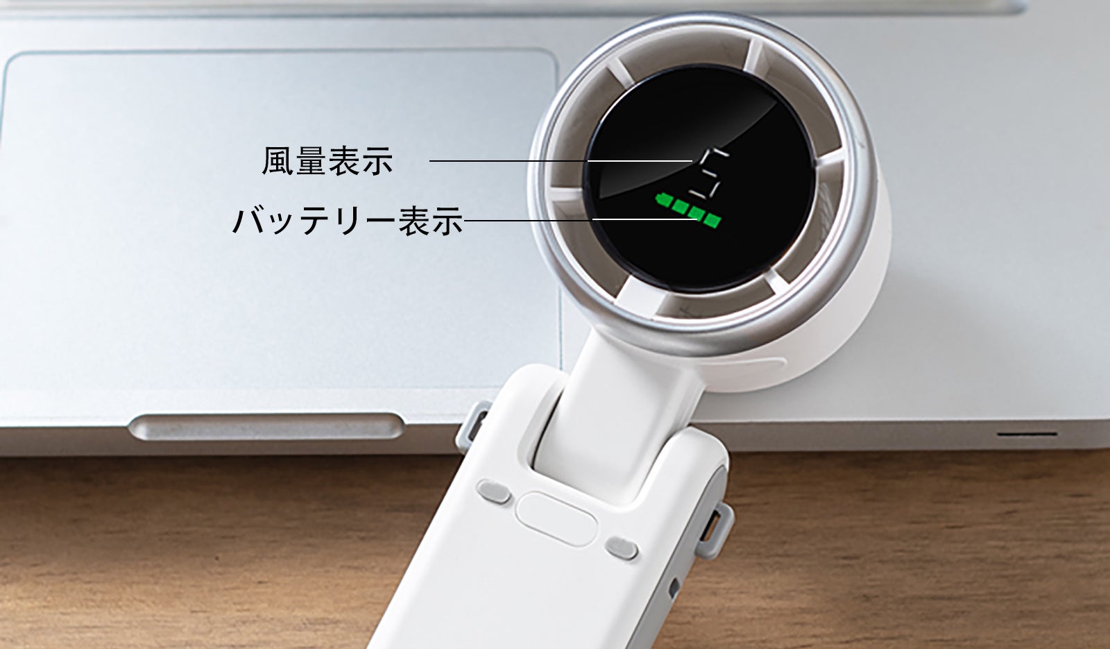 手持ちももちろん、折り曲げて卓上扇風機としても使えます。