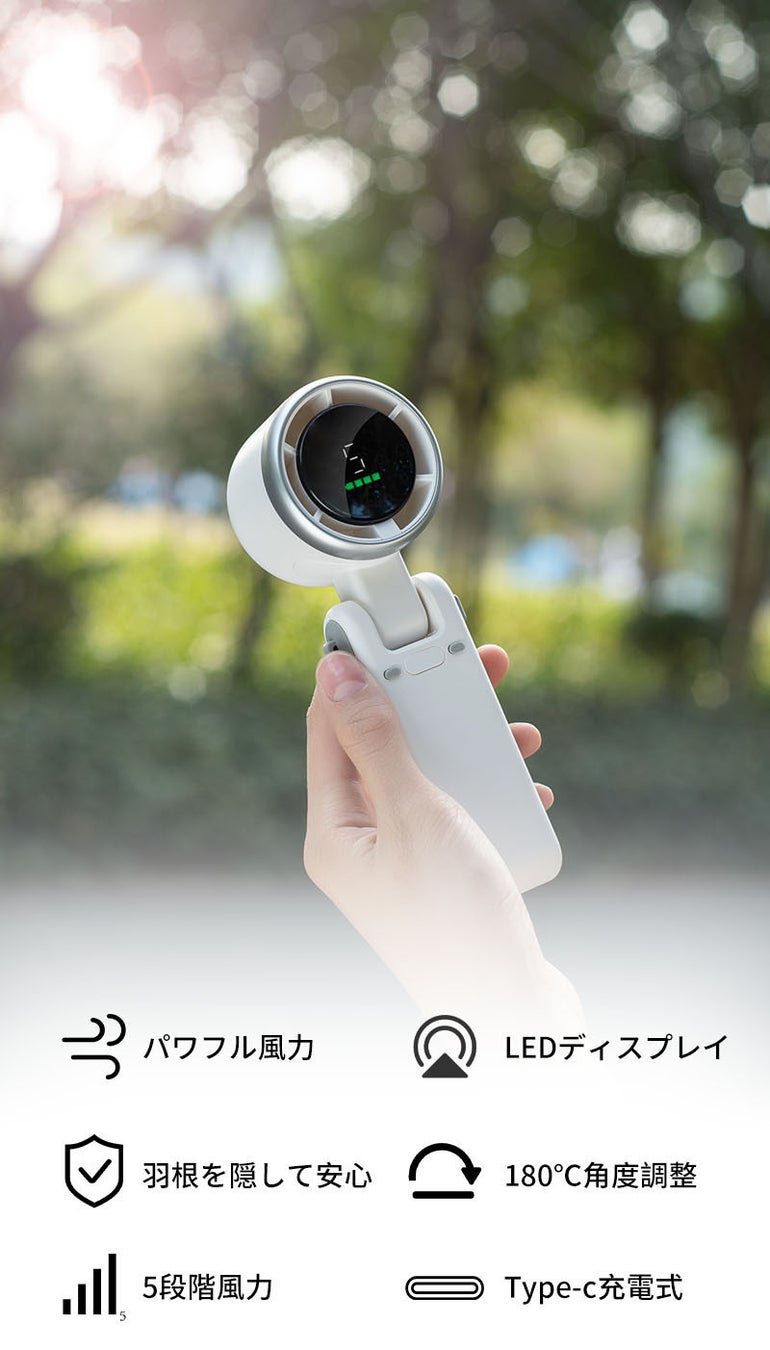 「SUPWELL手持ち式ターボ扇風機」は、隠し羽根デザインを採用し、180度折りたたむことでコンパクトかつ強力な風を生み出すことができ、モード1だけでも涼しく感じることができ、さらにLEDディスプレイを搭載しています。風量や残量が一目瞭然なので、突然のバッテリー切れの心配がなく、どこにいても安心してご使用いただけます。