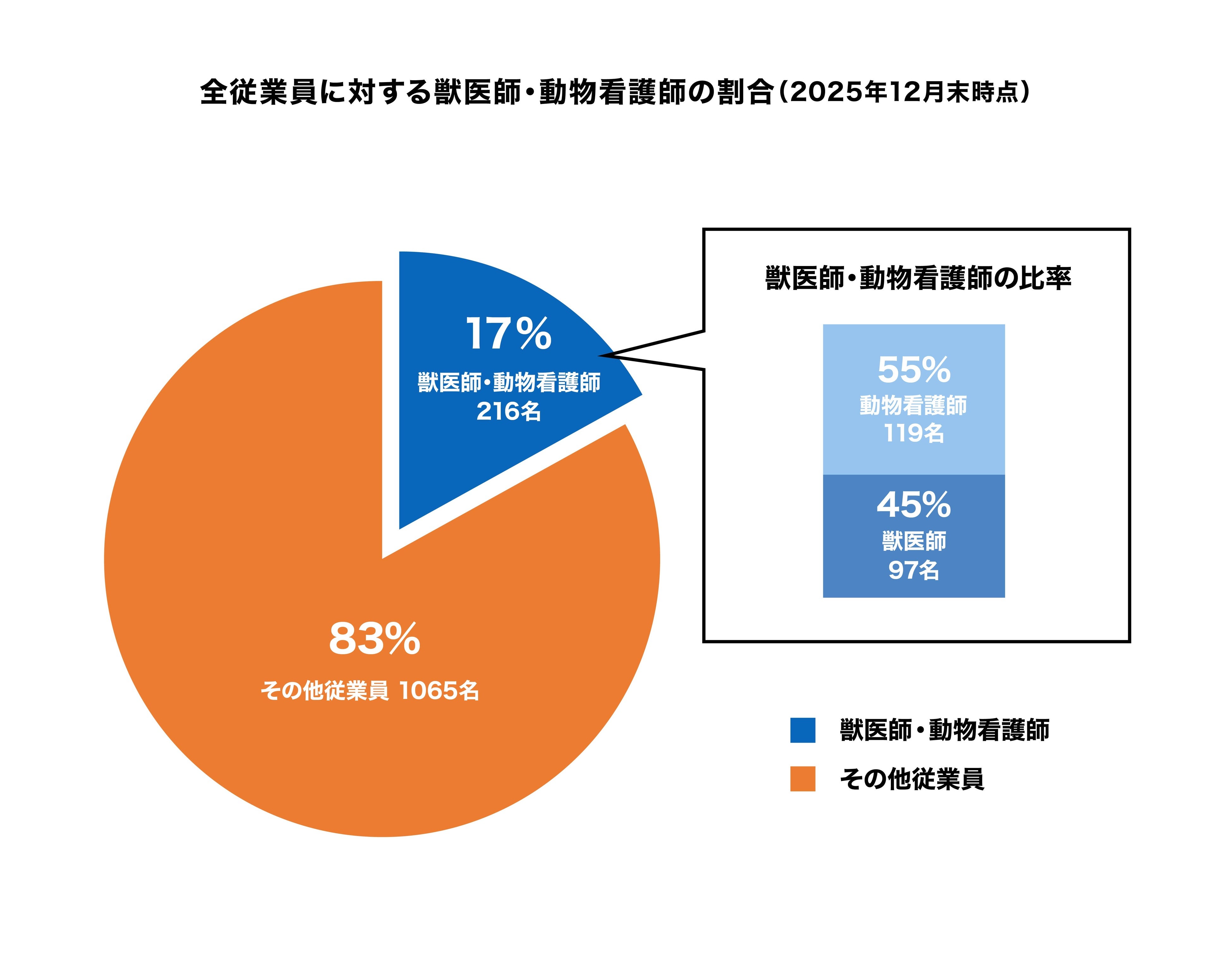 死亡事故ゼロの実現と、さらなるペットのウェルネス向上を目指し、人員体制の拡充を進めた結果、2025年12月末時点における獣医師・動物看護師の割合は17%(計216名 ※業務委託含む)となっています。